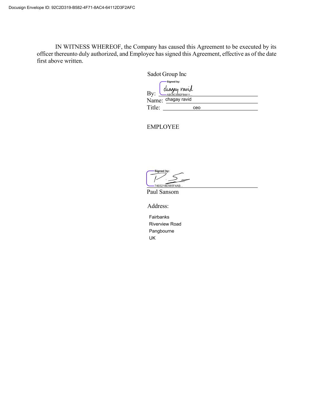 IN WITNESS WHEREOF, the Company has caused this Agreement to be executed by its officer thereunto duly authorized, and Employee has signed this Agreement, effective as of the date first above written. Sadot Group Inc By: Name: Title: EMPLOYEE Paul Sansom Address: Docusign Envelope ID: 92C2D319-B582-4F71-8AC4-64112D3F2AFC chagay ravid ceo Fairbanks Riverview Road Pangbourne UK