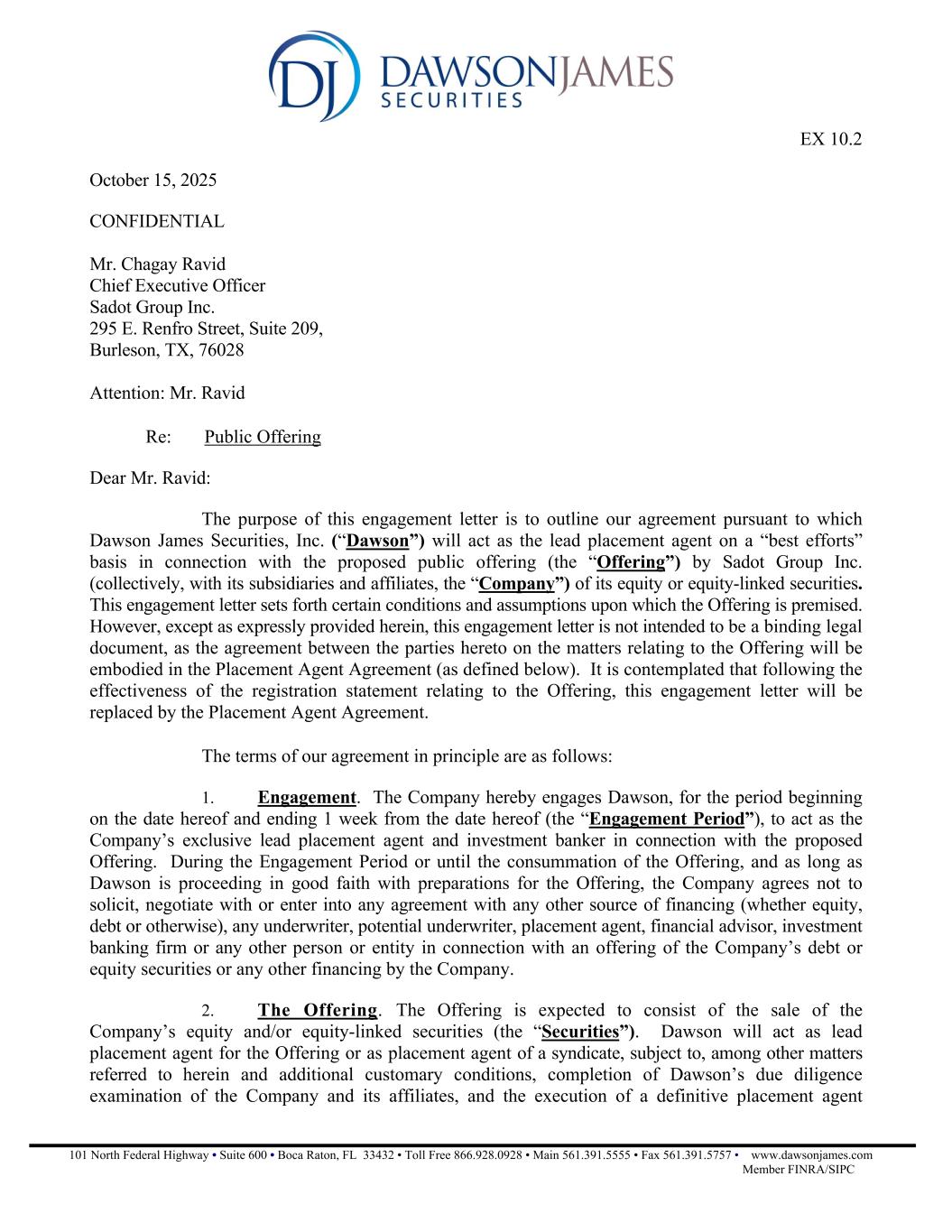 101 North Federal Highway • Suite 600 • Boca Raton, FL 33432 • Toll Free 866.928.0928 • Main 561.391.5555 • Fax 561.391.5757 • www.dawsonjames.com Member FINRA/SIPC EX 10.2 October 15, 2025 CONFIDENTIAL Mr. Chagay Ravid Chief Executive Officer Sadot Group Inc. 295 E. Renfro Street, Suite 209, Burleson, TX, 76028 Attention: Mr. Ravid Re: Public Offering Dear Mr. Ravid: The purpose of this engagement letter is to outline our agreement pursuant to which Dawson James Securities, Inc. (“Dawson”) will act as the lead placement agent on a “best efforts” basis in connection with the proposed public offering (the “Offering”) by Sadot Group Inc. (collectively, with its subsidiaries and affiliates, the “Company”) of its equity or equity-linked securities. This engagement letter sets forth certain conditions and assumptions upon which the Offering is premised. However, except as expressly provided herein, this engagement letter is not intended to be a binding legal document, as the agreement between the parties hereto on the matters relating to the Offering will be embodied in the Placement Agent Agreement (as defined below). It is contemplated that following the effectiveness of the registration statement relating to the Offering, this engagement letter will be replaced by the Placement Agent Agreement. The terms of our agreement in principle are as follows: 1. Engagement. The Company hereby engages Dawson, for the period beginning on the date hereof and ending 1 week from the date hereof (the “Engagement Period”), to act as the Company’s exclusive lead placement agent and investment banker in connection with the proposed Offering. During the Engagement Period or until the consummation of the Offering, and as long as Dawson is proceeding in good faith with preparations for the Offering, the Company agrees not to solicit, negotiate with or enter into any agreement with any other source of financing (whether equity, debt or otherwise), any underwriter, potential underwriter, placement agent, financial advisor, investment banking firm or any other person or entity in connection with an offering of the Company’s debt or equity securities or any other financing by the Company. 2. The Offering. The Offering is expected to consist of the sale of the Company’s equity and/or equity-linked securities (the “Securities”). Dawson will act as lead placement agent for the Offering or as placement agent of a syndicate, subject to, among other matters referred to herein and additional customary conditions, completion of Dawson’s due diligence examination of the Company and its affiliates, and the execution of a definitive placement agent