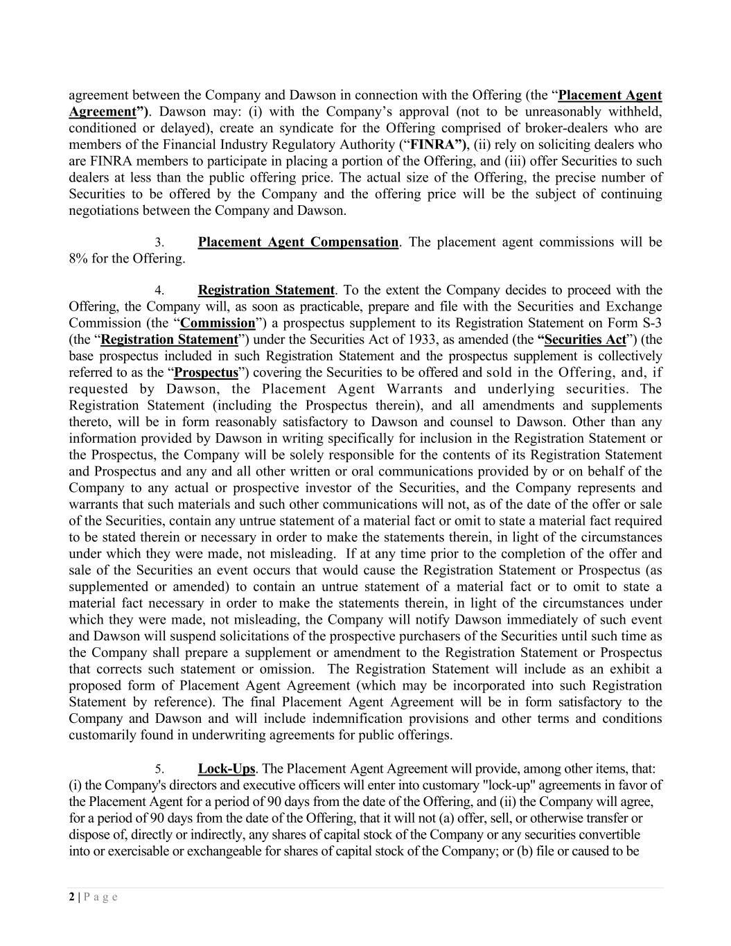 2 | P a g e agreement between the Company and Dawson in connection with the Offering (the “Placement Agent Agreement”). Dawson may: (i) with the Company’s approval (not to be unreasonably withheld, conditioned or delayed), create an syndicate for the Offering comprised of broker-dealers who are members of the Financial Industry Regulatory Authority (“FINRA”), (ii) rely on soliciting dealers who are FINRA members to participate in placing a portion of the Offering, and (iii) offer Securities to such dealers at less than the public offering price. The actual size of the Offering, the precise number of Securities to be offered by the Company and the offering price will be the subject of continuing negotiations between the Company and Dawson. 3. Placement Agent Compensation. The placement agent commissions will be 8% for the Offering. 4. Registration Statement. To the extent the Company decides to proceed with the Offering, the Company will, as soon as practicable, prepare and file with the Securities and Exchange Commission (the “Commission”) a prospectus supplement to its Registration Statement on Form S-3 (the “Registration Statement”) under the Securities Act of 1933, as amended (the “Securities Act”) (the base prospectus included in such Registration Statement and the prospectus supplement is collectively referred to as the “Prospectus”) covering the Securities to be offered and sold in the Offering, and, if requested by Dawson, the Placement Agent Warrants and underlying securities. The Registration Statement (including the Prospectus therein), and all amendments and supplements thereto, will be in form reasonably satisfactory to Dawson and counsel to Dawson. Other than any information provided by Dawson in writing specifically for inclusion in the Registration Statement or the Prospectus, the Company will be solely responsible for the contents of its Registration Statement and Prospectus and any and all other written or oral communications provided by or on behalf of the Company to any actual or prospective investor of the Securities, and the Company represents and warrants that such materials and such other communications will not, as of the date of the offer or sale of the Securities, contain any untrue statement of a material fact or omit to state a material fact required to be stated therein or necessary in order to make the statements therein, in light of the circumstances under which they were made, not misleading. If at any time prior to the completion of the offer and sale of the Securities an event occurs that would cause the Registration Statement or Prospectus (as supplemented or amended) to contain an untrue statement of a material fact or to omit to state a material fact necessary in order to make the statements therein, in light of the circumstances under which they were made, not misleading, the Company will notify Dawson immediately of such event and Dawson will suspend solicitations of the prospective purchasers of the Securities until such time as the Company shall prepare a supplement or amendment to the Registration Statement or Prospectus that corrects such statement or omission. The Registration Statement will include as an exhibit a proposed form of Placement Agent Agreement (which may be incorporated into such Registration Statement by reference). The final Placement Agent Agreement will be in form satisfactory to the Company and Dawson and will include indemnification provisions and other terms and conditions customarily found in underwriting agreements for public offerings. 5. Lock-Ups. The Placement Agent Agreement will provide, among other items, that: (i) the Company's directors and executive officers will enter into customary "lock-up" agreements in favor of the Placement Agent for a period of 90 days from the date of the Offering, and (ii) the Company will agree, for a period of 90 days from the date of the Offering, that it will not (a) offer, sell, or otherwise transfer or dispose of, directly or indirectly, any shares of capital stock of the Company or any securities convertible into or exercisable or exchangeable for shares of capital stock of the Company; or (b) file or caused to be