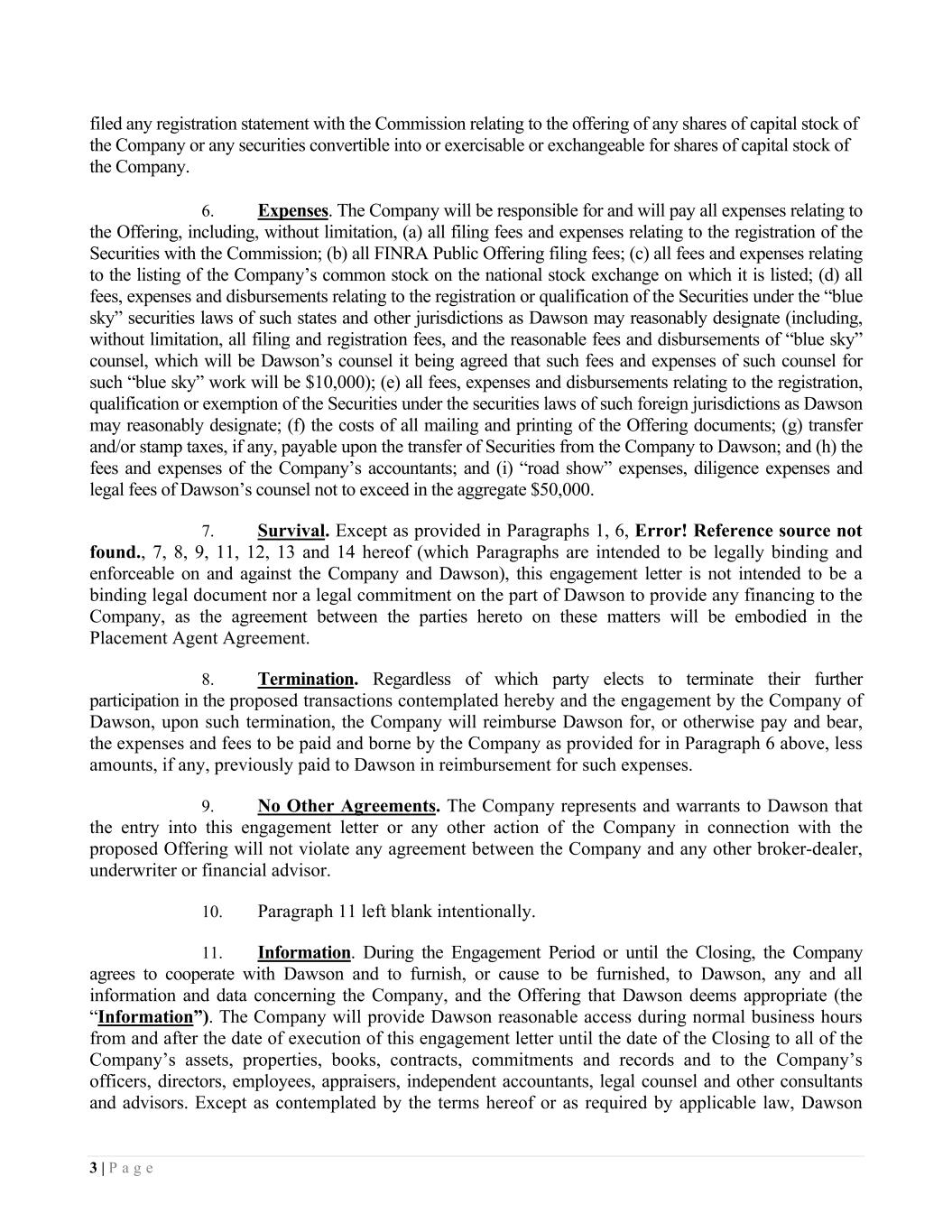 3 | P a g e filed any registration statement with the Commission relating to the offering of any shares of capital stock of the Company or any securities convertible into or exercisable or exchangeable for shares of capital stock of the Company. 6. Expenses. The Company will be responsible for and will pay all expenses relating to the Offering, including, without limitation, (a) all filing fees and expenses relating to the registration of the Securities with the Commission; (b) all FINRA Public Offering filing fees; (c) all fees and expenses relating to the listing of the Company’s common stock on the national stock exchange on which it is listed; (d) all fees, expenses and disbursements relating to the registration or qualification of the Securities under the “blue sky” securities laws of such states and other jurisdictions as Dawson may reasonably designate (including, without limitation, all filing and registration fees, and the reasonable fees and disbursements of “blue sky” counsel, which will be Dawson’s counsel it being agreed that such fees and expenses of such counsel for such “blue sky” work will be $10,000); (e) all fees, expenses and disbursements relating to the registration, qualification or exemption of the Securities under the securities laws of such foreign jurisdictions as Dawson may reasonably designate; (f) the costs of all mailing and printing of the Offering documents; (g) transfer and/or stamp taxes, if any, payable upon the transfer of Securities from the Company to Dawson; and (h) the fees and expenses of the Company’s accountants; and (i) “road show” expenses, diligence expenses and legal fees of Dawson’s counsel not to exceed in the aggregate $50,000. 7. Survival. Except as provided in Paragraphs 1, 6, Error! Reference source not found., 7, 8, 9, 11, 12, 13 and 14 hereof (which Paragraphs are intended to be legally binding and enforceable on and against the Company and Dawson), this engagement letter is not intended to be a binding legal document nor a legal commitment on the part of Dawson to provide any financing to the Company, as the agreement between the parties hereto on these matters will be embodied in the Placement Agent Agreement. 8. Termination. Regardless of which party elects to terminate their further participation in the proposed transactions contemplated hereby and the engagement by the Company of Dawson, upon such termination, the Company will reimburse Dawson for, or otherwise pay and bear, the expenses and fees to be paid and borne by the Company as provided for in Paragraph 6 above, less amounts, if any, previously paid to Dawson in reimbursement for such expenses. 9. No Other Agreements. The Company represents and warrants to Dawson that the entry into this engagement letter or any other action of the Company in connection with the proposed Offering will not violate any agreement between the Company and any other broker-dealer, underwriter or financial advisor. 10. Paragraph 11 left blank intentionally. 11. Information. During the Engagement Period or until the Closing, the Company agrees to cooperate with Dawson and to furnish, or cause to be furnished, to Dawson, any and all information and data concerning the Company, and the Offering that Dawson deems appropriate (the “Information”). The Company will provide Dawson reasonable access during normal business hours from and after the date of execution of this engagement letter until the date of the Closing to all of the Company’s assets, properties, books, contracts, commitments and records and to the Company’s officers, directors, employees, appraisers, independent accountants, legal counsel and other consultants and advisors. Except as contemplated by the terms hereof or as required by applicable law, Dawson