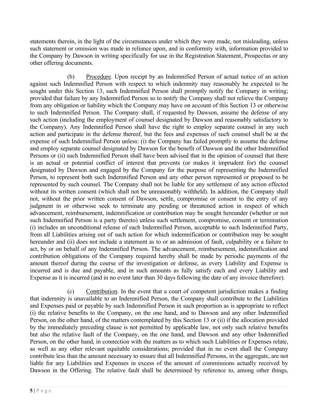 5 | P a g e statements therein, in the light of the circumstances under which they were made, not misleading, unless such statement or omission was made in reliance upon, and in conformity with, information provided to the Company by Dawson in writing specifically for use in the Registration Statement, Prospectus or any other offering documents. (b) Procedure. Upon receipt by an Indemnified Person of actual notice of an action against such Indemnified Person with respect to which indemnity may reasonably be expected to be sought under this Section 13, such Indemnified Person shall promptly notify the Company in writing; provided that failure by any Indemnified Person so to notify the Company shall not relieve the Company from any obligation or liability which the Company may have on account of this Section 13 or otherwise to such Indemnified Person. The Company shall, if requested by Dawson, assume the defense of any such action (including the employment of counsel designated by Dawson and reasonably satisfactory to the Company). Any Indemnified Person shall have the right to employ separate counsel in any such action and participate in the defense thereof, but the fees and expenses of such counsel shall be at the expense of such Indemnified Person unless: (i) the Company has failed promptly to assume the defense and employ separate counsel designated by Dawson for the benefit of Dawson and the other Indemnified Persons or (ii) such Indemnified Person shall have been advised that in the opinion of counsel that there is an actual or potential conflict of interest that prevents (or makes it imprudent for) the counsel designated by Dawson and engaged by the Company for the purpose of representing the Indemnified Person, to represent both such Indemnified Person and any other person represented or proposed to be represented by such counsel. The Company shall not be liable for any settlement of any action effected without its written consent (which shall not be unreasonably withheld). In addition, the Company shall not, without the prior written consent of Dawson, settle, compromise or consent to the entry of any judgment in or otherwise seek to terminate any pending or threatened action in respect of which advancement, reimbursement, indemnification or contribution may be sought hereunder (whether or not such Indemnified Person is a party thereto) unless such settlement, compromise, consent or termination (i) includes an unconditional release of each Indemnified Person, acceptable to such Indemnified Party, from all Liabilities arising out of such action for which indemnification or contribution may be sought hereunder and (ii) does not include a statement as to or an admission of fault, culpability or a failure to act, by or on behalf of any Indemnified Person. The advancement, reimbursement, indemnification and contribution obligations of the Company required hereby shall be made by periodic payments of the amount thereof during the course of the investigation or defense, as every Liability and Expense is incurred and is due and payable, and in such amounts as fully satisfy each and every Liability and Expense as it is incurred (and in no event later than 30 days following the date of any invoice therefore). (c) Contribution. In the event that a court of competent jurisdiction makes a finding that indemnity is unavailable to an Indemnified Person, the Company shall contribute to the Liabilities and Expenses paid or payable by such Indemnified Person in such proportion as is appropriate to reflect (i) the relative benefits to the Company, on the one hand, and to Dawson and any other Indemnified Person, on the other hand, of the matters contemplated by this Section 13 or (ii) if the allocation provided by the immediately preceding clause is not permitted by applicable law, not only such relative benefits but also the relative fault of the Company, on the one hand, and Dawson and any other Indemnified Person, on the other hand, in connection with the matters as to which such Liabilities or Expenses relate, as well as any other relevant equitable considerations; provided that in no event shall the Company contribute less than the amount necessary to ensure that all Indemnified Persons, in the aggregate, are not liable for any Liabilities and Expenses in excess of the amount of commissions actually received by Dawson in the Offering. The relative fault shall be determined by reference to, among other things,