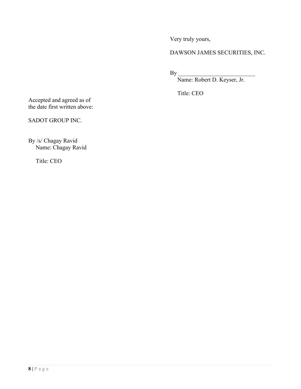 8 | P a g e Very truly yours, DAWSON JAMES SECURITIES, INC. By __________________________ Name: Robert D. Keyser, Jr. Title: CEO Accepted and agreed as of the date first written above: SADOT GROUP INC. By /s/ Chagay Ravid Name: Chagay Ravid Title: CEO