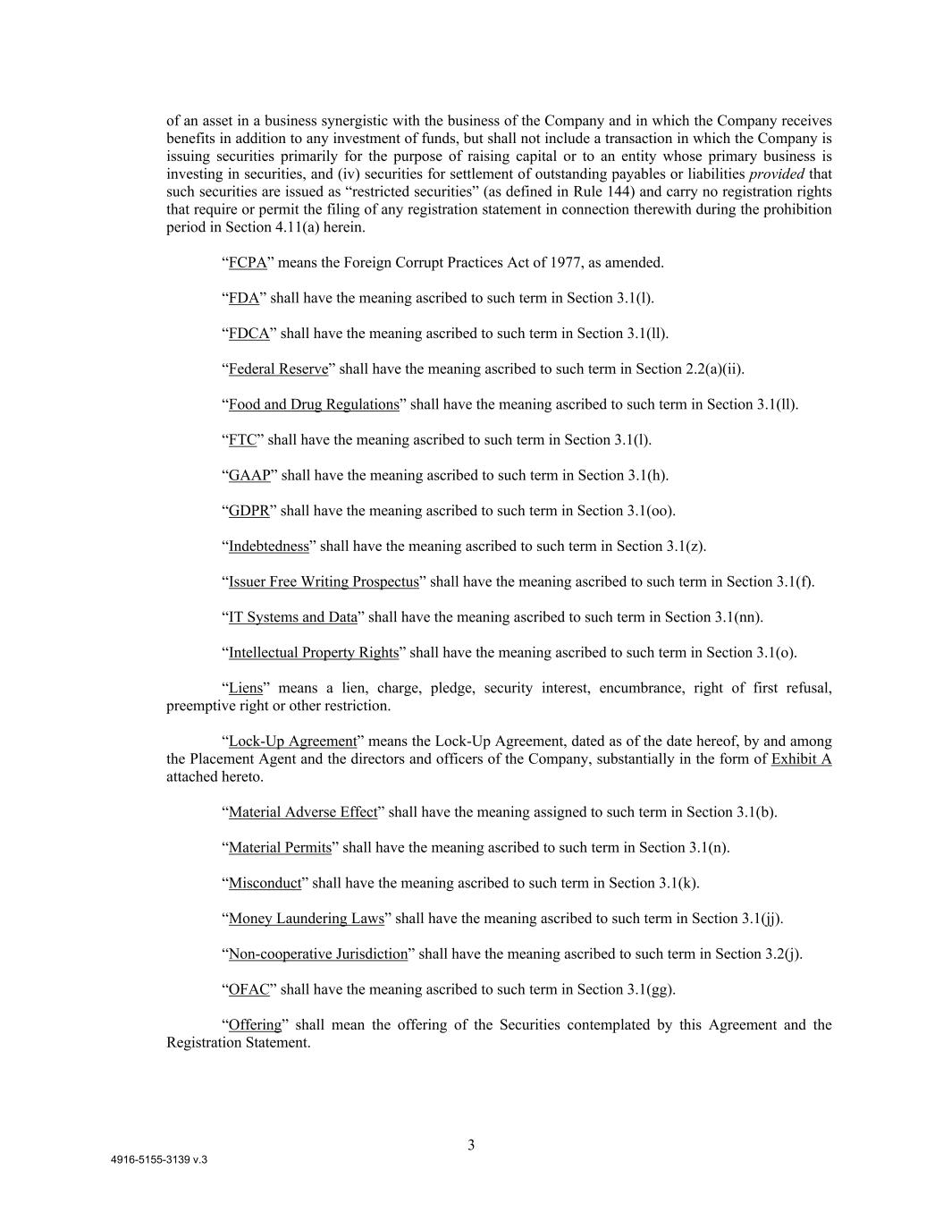 3 4916-5155-3139 v.3 of an asset in a business synergistic with the business of the Company and in which the Company receives benefits in addition to any investment of funds, but shall not include a transaction in which the Company is issuing securities primarily for the purpose of raising capital or to an entity whose primary business is investing in securities, and (iv) securities for settlement of outstanding payables or liabilities provided that such securities are issued as “restricted securities” (as defined in Rule 144) and carry no registration rights that require or permit the filing of any registration statement in connection therewith during the prohibition period in Section 4.11(a) herein. “FCPA” means the Foreign Corrupt Practices Act of 1977, as amended. “FDA” shall have the meaning ascribed to such term in Section 3.1(l). “FDCA” shall have the meaning ascribed to such term in Section 3.1(ll). “Federal Reserve” shall have the meaning ascribed to such term in Section 2.2(a)(ii). “Food and Drug Regulations” shall have the meaning ascribed to such term in Section 3.1(ll). “FTC” shall have the meaning ascribed to such term in Section 3.1(l). “GAAP” shall have the meaning ascribed to such term in Section 3.1(h). “GDPR” shall have the meaning ascribed to such term in Section 3.1(oo). “Indebtedness” shall have the meaning ascribed to such term in Section 3.1(z). “Issuer Free Writing Prospectus” shall have the meaning ascribed to such term in Section 3.1(f). “IT Systems and Data” shall have the meaning ascribed to such term in Section 3.1(nn). “Intellectual Property Rights” shall have the meaning ascribed to such term in Section 3.1(o). “Liens” means a lien, charge, pledge, security interest, encumbrance, right of first refusal, preemptive right or other restriction. “Lock-Up Agreement” means the Lock-Up Agreement, dated as of the date hereof, by and among the Placement Agent and the directors and officers of the Company, substantially in the form of Exhibit A attached hereto. “Material Adverse Effect” shall have the meaning assigned to such term in Section 3.1(b). “Material Permits” shall have the meaning ascribed to such term in Section 3.1(n). “Misconduct” shall have the meaning ascribed to such term in Section 3.1(k). “Money Laundering Laws” shall have the meaning ascribed to such term in Section 3.1(jj). “Non-cooperative Jurisdiction” shall have the meaning ascribed to such term in Section 3.2(j). “OFAC” shall have the meaning ascribed to such term in Section 3.1(gg). “Offering” shall mean the offering of the Securities contemplated by this Agreement and the Registration Statement.