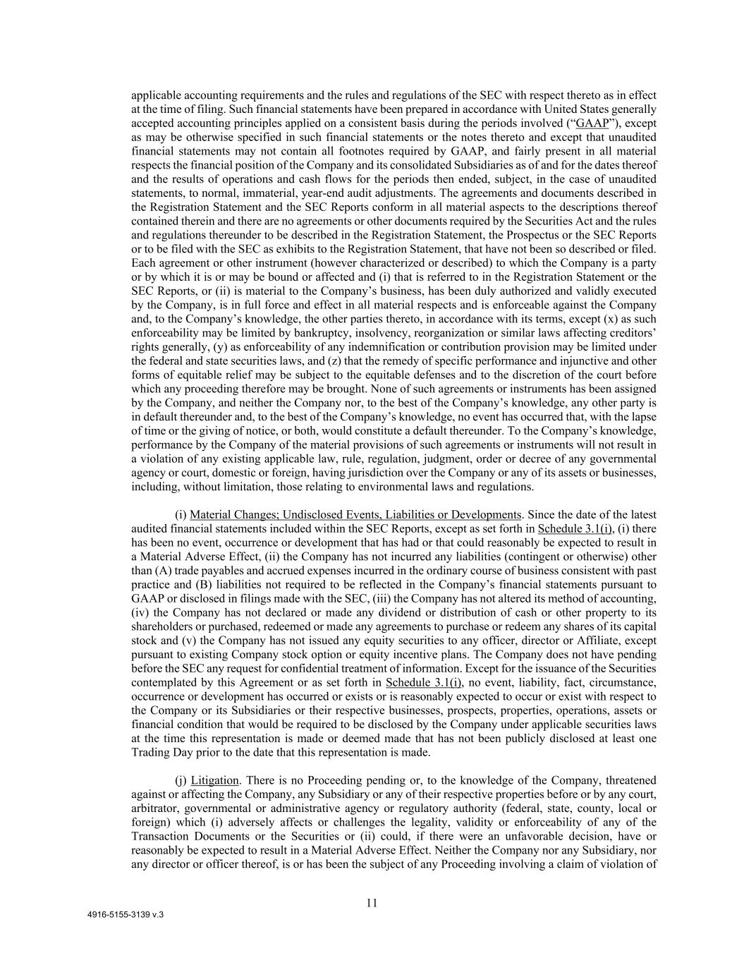 11 4916-5155-3139 v.3 applicable accounting requirements and the rules and regulations of the SEC with respect thereto as in effect at the time of filing. Such financial statements have been prepared in accordance with United States generally accepted accounting principles applied on a consistent basis during the periods involved (“GAAP”), except as may be otherwise specified in such financial statements or the notes thereto and except that unaudited financial statements may not contain all footnotes required by GAAP, and fairly present in all material respects the financial position of the Company and its consolidated Subsidiaries as of and for the dates thereof and the results of operations and cash flows for the periods then ended, subject, in the case of unaudited statements, to normal, immaterial, year-end audit adjustments. The agreements and documents described in the Registration Statement and the SEC Reports conform in all material aspects to the descriptions thereof contained therein and there are no agreements or other documents required by the Securities Act and the rules and regulations thereunder to be described in the Registration Statement, the Prospectus or the SEC Reports or to be filed with the SEC as exhibits to the Registration Statement, that have not been so described or filed. Each agreement or other instrument (however characterized or described) to which the Company is a party or by which it is or may be bound or affected and (i) that is referred to in the Registration Statement or the SEC Reports, or (ii) is material to the Company’s business, has been duly authorized and validly executed by the Company, is in full force and effect in all material respects and is enforceable against the Company and, to the Company’s knowledge, the other parties thereto, in accordance with its terms, except (x) as such enforceability may be limited by bankruptcy, insolvency, reorganization or similar laws affecting creditors’ rights generally, (y) as enforceability of any indemnification or contribution provision may be limited under the federal and state securities laws, and (z) that the remedy of specific performance and injunctive and other forms of equitable relief may be subject to the equitable defenses and to the discretion of the court before which any proceeding therefore may be brought. None of such agreements or instruments has been assigned by the Company, and neither the Company nor, to the best of the Company’s knowledge, any other party is in default thereunder and, to the best of the Company’s knowledge, no event has occurred that, with the lapse of time or the giving of notice, or both, would constitute a default thereunder. To the Company’s knowledge, performance by the Company of the material provisions of such agreements or instruments will not result in a violation of any existing applicable law, rule, regulation, judgment, order or decree of any governmental agency or court, domestic or foreign, having jurisdiction over the Company or any of its assets or businesses, including, without limitation, those relating to environmental laws and regulations. (i) Material Changes; Undisclosed Events, Liabilities or Developments. Since the date of the latest audited financial statements included within the SEC Reports, except as set forth in Schedule 3.1(i), (i) there has been no event, occurrence or development that has had or that could reasonably be expected to result in a Material Adverse Effect, (ii) the Company has not incurred any liabilities (contingent or otherwise) other than (A) trade payables and accrued expenses incurred in the ordinary course of business consistent with past practice and (B) liabilities not required to be reflected in the Company’s financial statements pursuant to GAAP or disclosed in filings made with the SEC, (iii) the Company has not altered its method of accounting, (iv) the Company has not declared or made any dividend or distribution of cash or other property to its shareholders or purchased, redeemed or made any agreements to purchase or redeem any shares of its capital stock and (v) the Company has not issued any equity securities to any officer, director or Affiliate, except pursuant to existing Company stock option or equity incentive plans. The Company does not have pending before the SEC any request for confidential treatment of information. Except for the issuance of the Securities contemplated by this Agreement or as set forth in Schedule 3.1(i), no event, liability, fact, circumstance, occurrence or development has occurred or exists or is reasonably expected to occur or exist with respect to the Company or its Subsidiaries or their respective businesses, prospects, properties, operations, assets or financial condition that would be required to be disclosed by the Company under applicable securities laws at the time this representation is made or deemed made that has not been publicly disclosed at least one Trading Day prior to the date that this representation is made. (j) Litigation. There is no Proceeding pending or, to the knowledge of the Company, threatened against or affecting the Company, any Subsidiary or any of their respective properties before or by any court, arbitrator, governmental or administrative agency or regulatory authority (federal, state, county, local or foreign) which (i) adversely affects or challenges the legality, validity or enforceability of any of the Transaction Documents or the Securities or (ii) could, if there were an unfavorable decision, have or reasonably be expected to result in a Material Adverse Effect. Neither the Company nor any Subsidiary, nor any director or officer thereof, is or has been the subject of any Proceeding involving a claim of violation of