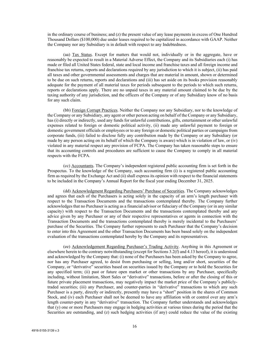 16 4916-5155-3139 v.3 in the ordinary course of business; and (z) the present value of any lease payments in excess of One Hundred Thousand Dollars ($100,000) due under leases required to be capitalized in accordance with GAAP. Neither the Company nor any Subsidiary is in default with respect to any Indebtedness. (aa) Tax Status. Except for matters that would not, individually or in the aggregate, have or reasonably be expected to result in a Material Adverse Effect, the Company and its Subsidiaries each (i) has made or filed all United States federal, state and local income and franchise taxes and all foreign income and franchise tax returns, reports and declarations required by any jurisdiction to which it is subject, (ii) has paid all taxes and other governmental assessments and charges that are material in amount, shown or determined to be due on such returns, reports and declarations and (iii) has set aside on its books provision reasonably adequate for the payment of all material taxes for periods subsequent to the periods to which such returns, reports or declarations apply. There are no unpaid taxes in any material amount claimed to be due by the taxing authority of any jurisdiction, and the officers of the Company or of any Subsidiary know of no basis for any such claim. (bb) Foreign Corrupt Practices. Neither the Company nor any Subsidiary, nor to the knowledge of the Company or any Subsidiary, any agent or other person acting on behalf of the Company or any Subsidiary, has (i) directly or indirectly, used any funds for unlawful contributions, gifts, entertainment or other unlawful expenses related to foreign or domestic political activity, (ii) made any unlawful payment to foreign or domestic government officials or employees or to any foreign or domestic political parties or campaigns from corporate funds, (iii) failed to disclose fully any contribution made by the Company or any Subsidiary (or made by any person acting on its behalf of which the Company is aware) which is in violation of law, or (iv) violated in any material respect any provision of FCPA. The Company has taken reasonable steps to ensure that its accounting controls and procedures are sufficient to cause the Company to comply in all material respects with the FCPA. (cc) Accountants. The Company’s independent registered public accounting firm is set forth in the Prospectus. To the knowledge of the Company, such accounting firm (i) is a registered public accounting firm as required by the Exchange Act and (ii) shall express its opinion with respect to the financial statements to be included in the Company’s Annual Report for the fiscal year ending December 31, 2025. (dd) Acknowledgment Regarding Purchasers’ Purchase of Securities. The Company acknowledges and agrees that each of the Purchasers is acting solely in the capacity of an arm’s length purchaser with respect to the Transaction Documents and the transactions contemplated thereby. The Company further acknowledges that no Purchaser is acting as a financial advisor or fiduciary of the Company (or in any similar capacity) with respect to the Transaction Documents and the transactions contemplated thereby and any advice given by any Purchaser or any of their respective representatives or agents in connection with the Transaction Documents and the transactions contemplated thereby is merely incidental to the Purchasers’ purchase of the Securities. The Company further represents to each Purchaser that the Company’s decision to enter into this Agreement and the other Transaction Documents has been based solely on the independent evaluation of the transactions contemplated hereby by the Company and its representatives. (ee) Acknowledgement Regarding Purchaser’s Trading Activity. Anything in this Agreement or elsewhere herein to the contrary notwithstanding (except for Sections 3.2(f) and 4.13 hereof), it is understood and acknowledged by the Company that: (i) none of the Purchasers has been asked by the Company to agree, nor has any Purchaser agreed, to desist from purchasing or selling, long and/or short, securities of the Company, or “derivative” securities based on securities issued by the Company or to hold the Securities for any specified term; (ii) past or future open market or other transactions by any Purchaser, specifically including, without limitation, Short Sales or “derivative” transactions, before or after the closing of this or future private placement transactions, may negatively impact the market price of the Company’s publicly- traded securities; (iii) any Purchaser, and counter-parties in “derivative” transactions to which any such Purchaser is a party, directly or indirectly, presently may have a “short” position in the shares of Common Stock, and (iv) each Purchaser shall not be deemed to have any affiliation with or control over any arm’s length counter-party in any “derivative” transaction. The Company further understands and acknowledges that (y) one or more Purchasers may engage in hedging activities at various times during the period that the Securities are outstanding, and (z) such hedging activities (if any) could reduce the value of the existing