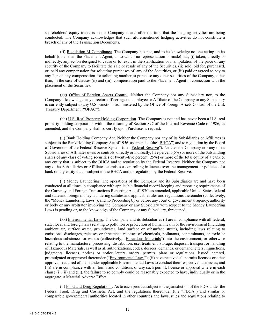 17 4916-5155-3139 v.3 shareholders’ equity interests in the Company at and after the time that the hedging activities are being conducted. The Company acknowledges that such aforementioned hedging activities do not constitute a breach of any of the Transaction Documents. (ff) Regulation M Compliance. The Company has not, and to its knowledge no one acting on its behalf (other than the Placement Agent, as to which no representation is made) has, (i) taken, directly or indirectly, any action designed to cause or to result in the stabilization or manipulation of the price of any security of the Company to facilitate the sale or resale of any of the Securities, (ii) sold, bid for, purchased, or, paid any compensation for soliciting purchases of, any of the Securities, or (iii) paid or agreed to pay to any Person any compensation for soliciting another to purchase any other securities of the Company, other than, in the case of clauses (ii) and (iii), compensation paid to the Placement Agent in connection with the placement of the Securities. (gg) Office of Foreign Assets Control. Neither the Company nor any Subsidiary nor, to the Company’s knowledge, any director, officer, agent, employee or Affiliate of the Company or any Subsidiary is currently subject to any U.S. sanctions administered by the Office of Foreign Assets Control of the U.S. Treasury Department (“OFAC”). (hh) U.S. Real Property Holding Corporation. The Company is not and has never been a U.S. real property holding corporation within the meaning of Section 897 of the Internal Revenue Code of 1986, as amended, and the Company shall so certify upon Purchaser’s request. (ii) Bank Holding Company Act. Neither the Company nor any of its Subsidiaries or Affiliates is subject to the Bank Holding Company Act of 1956, as amended (the “BHCA”) and to regulation by the Board of Governors of the Federal Reserve System (the “Federal Reserve”). Neither the Company nor any of its Subsidiaries or Affiliates owns or controls, directly or indirectly, five percent (5%) or more of the outstanding shares of any class of voting securities or twenty-five percent (25%) or more of the total equity of a bank or any entity that is subject to the BHCA and to regulation by the Federal Reserve. Neither the Company nor any of its Subsidiaries or Affiliates exercises a controlling influence over the management or policies of a bank or any entity that is subject to the BHCA and to regulation by the Federal Reserve. (jj) Money Laundering. The operations of the Company and its Subsidiaries are and have been conducted at all times in compliance with applicable financial record-keeping and reporting requirements of the Currency and Foreign Transactions Reporting Act of 1970, as amended, applicable United States federal and state and foreign money laundering statutes and applicable rules and regulations thereunder (collectively, the “Money Laundering Laws”), and no Proceeding by or before any court or governmental agency, authority or body or any arbitrator involving the Company or any Subsidiary with respect to the Money Laundering Laws is pending or, to the knowledge of the Company or any Subsidiary, threatened. (kk) Environmental Laws. The Company and its Subsidiaries (i) are in compliance with all federal, state, local and foreign laws relating to pollution or protection of human health or the environment (including ambient air, surface water, groundwater, land surface or subsurface strata), including laws relating to emissions, discharges, releases or threatened releases of chemicals, pollutants, contaminants, or toxic or hazardous substances or wastes (collectively, “Hazardous Materials”) into the environment, or otherwise relating to the manufacture, processing, distribution, use, treatment, storage, disposal, transport or handling of Hazardous Materials, as well as all authorizations, codes, decrees, demands, or demand letters, injunctions, judgments, licenses, notices or notice letters, orders, permits, plans or regulations, issued, entered, promulgated or approved thereunder (“Environmental Laws”); (ii) have received all permits licenses or other approvals required of them under applicable Environmental Laws to conduct their respective businesses; and (iii) are in compliance with all terms and conditions of any such permit, license or approval where in each clause (i), (ii) and (iii), the failure to so comply could be reasonably expected to have, individually or in the aggregate, a Material Adverse Effect. (ll) Food and Drug Regulations. As to each product subject to the jurisdiction of the FDA under the Federal Food, Drug and Cosmetic Act, and the regulations thereunder (the “FDCA”) and similar or comparable governmental authorities located in other countries and laws, rules and regulations relating to