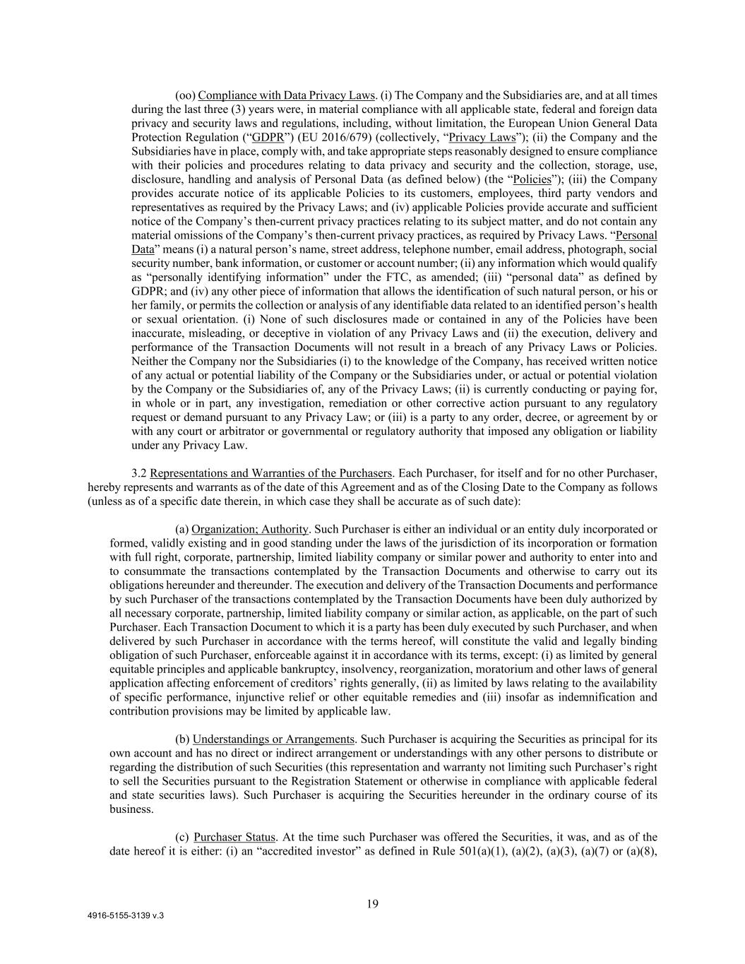 19 4916-5155-3139 v.3 (oo) Compliance with Data Privacy Laws. (i) The Company and the Subsidiaries are, and at all times during the last three (3) years were, in material compliance with all applicable state, federal and foreign data privacy and security laws and regulations, including, without limitation, the European Union General Data Protection Regulation (“GDPR”) (EU 2016/679) (collectively, “Privacy Laws”); (ii) the Company and the Subsidiaries have in place, comply with, and take appropriate steps reasonably designed to ensure compliance with their policies and procedures relating to data privacy and security and the collection, storage, use, disclosure, handling and analysis of Personal Data (as defined below) (the “Policies”); (iii) the Company provides accurate notice of its applicable Policies to its customers, employees, third party vendors and representatives as required by the Privacy Laws; and (iv) applicable Policies provide accurate and sufficient notice of the Company’s then-current privacy practices relating to its subject matter, and do not contain any material omissions of the Company’s then-current privacy practices, as required by Privacy Laws. “Personal Data” means (i) a natural person’s name, street address, telephone number, email address, photograph, social security number, bank information, or customer or account number; (ii) any information which would qualify as “personally identifying information” under the FTC, as amended; (iii) “personal data” as defined by GDPR; and (iv) any other piece of information that allows the identification of such natural person, or his or her family, or permits the collection or analysis of any identifiable data related to an identified person’s health or sexual orientation. (i) None of such disclosures made or contained in any of the Policies have been inaccurate, misleading, or deceptive in violation of any Privacy Laws and (ii) the execution, delivery and performance of the Transaction Documents will not result in a breach of any Privacy Laws or Policies. Neither the Company nor the Subsidiaries (i) to the knowledge of the Company, has received written notice of any actual or potential liability of the Company or the Subsidiaries under, or actual or potential violation by the Company or the Subsidiaries of, any of the Privacy Laws; (ii) is currently conducting or paying for, in whole or in part, any investigation, remediation or other corrective action pursuant to any regulatory request or demand pursuant to any Privacy Law; or (iii) is a party to any order, decree, or agreement by or with any court or arbitrator or governmental or regulatory authority that imposed any obligation or liability under any Privacy Law. 3.2 Representations and Warranties of the Purchasers. Each Purchaser, for itself and for no other Purchaser, hereby represents and warrants as of the date of this Agreement and as of the Closing Date to the Company as follows (unless as of a specific date therein, in which case they shall be accurate as of such date): (a) Organization; Authority. Such Purchaser is either an individual or an entity duly incorporated or formed, validly existing and in good standing under the laws of the jurisdiction of its incorporation or formation with full right, corporate, partnership, limited liability company or similar power and authority to enter into and to consummate the transactions contemplated by the Transaction Documents and otherwise to carry out its obligations hereunder and thereunder. The execution and delivery of the Transaction Documents and performance by such Purchaser of the transactions contemplated by the Transaction Documents have been duly authorized by all necessary corporate, partnership, limited liability company or similar action, as applicable, on the part of such Purchaser. Each Transaction Document to which it is a party has been duly executed by such Purchaser, and when delivered by such Purchaser in accordance with the terms hereof, will constitute the valid and legally binding obligation of such Purchaser, enforceable against it in accordance with its terms, except: (i) as limited by general equitable principles and applicable bankruptcy, insolvency, reorganization, moratorium and other laws of general application affecting enforcement of creditors’ rights generally, (ii) as limited by laws relating to the availability of specific performance, injunctive relief or other equitable remedies and (iii) insofar as indemnification and contribution provisions may be limited by applicable law. (b) Understandings or Arrangements. Such Purchaser is acquiring the Securities as principal for its own account and has no direct or indirect arrangement or understandings with any other persons to distribute or regarding the distribution of such Securities (this representation and warranty not limiting such Purchaser’s right to sell the Securities pursuant to the Registration Statement or otherwise in compliance with applicable federal and state securities laws). Such Purchaser is acquiring the Securities hereunder in the ordinary course of its business. (c)  Purchaser Status. At the time such Purchaser was offered the Securities, it was, and as of the date hereof it is either: (i) an “accredited investor” as defined in Rule 501(a)(1), (a)(2), (a)(3), (a)(7) or (a)(8),
