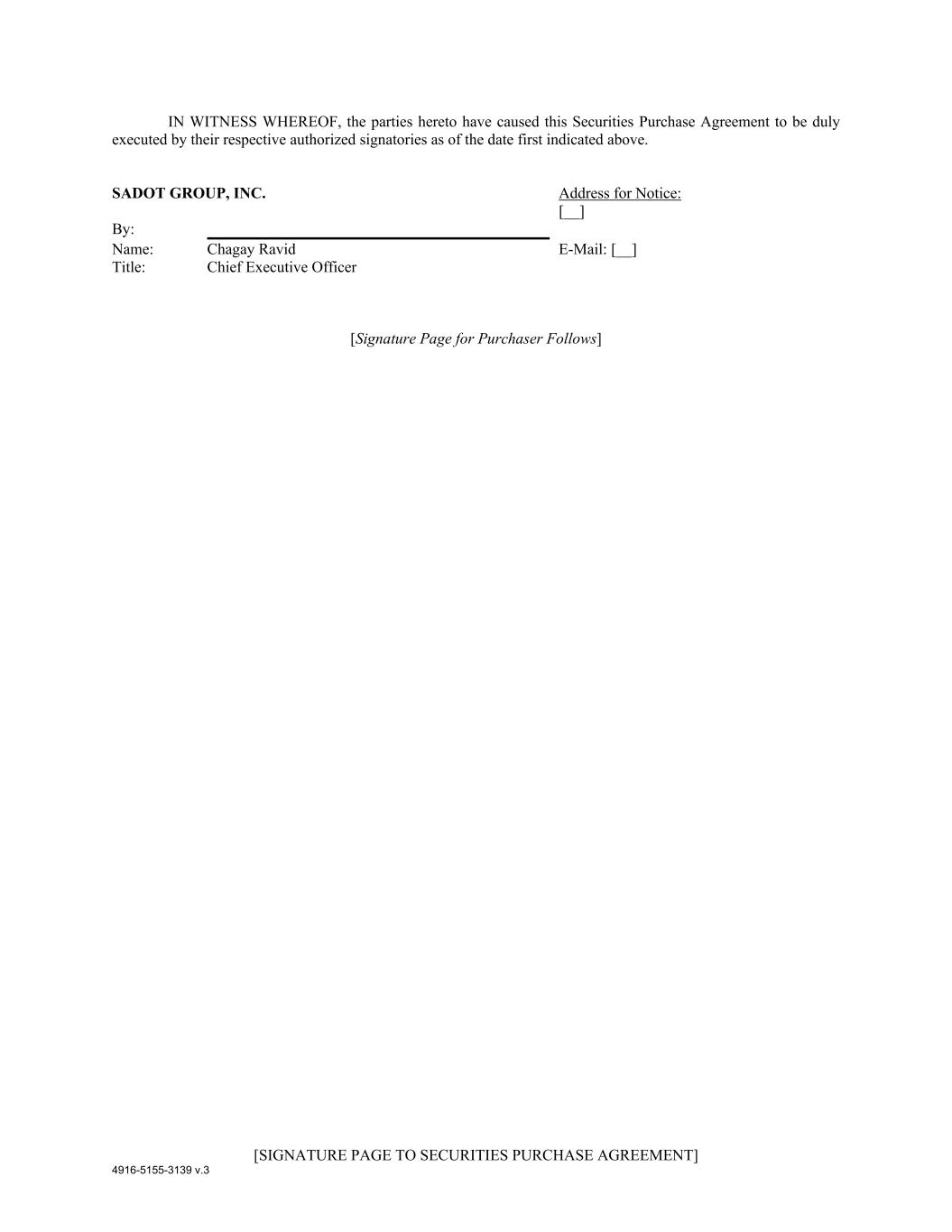 [SIGNATURE PAGE TO SECURITIES PURCHASE AGREEMENT] 4916-5155-3139 v.3 IN WITNESS WHEREOF, the parties hereto have caused this Securities Purchase Agreement to be duly executed by their respective authorized signatories as of the date first indicated above. SADOT GROUP, INC. Address for Notice: [__] By: Name: Chagay Ravid E-Mail: [__] Title: Chief Executive Officer [Signature Page for Purchaser Follows]