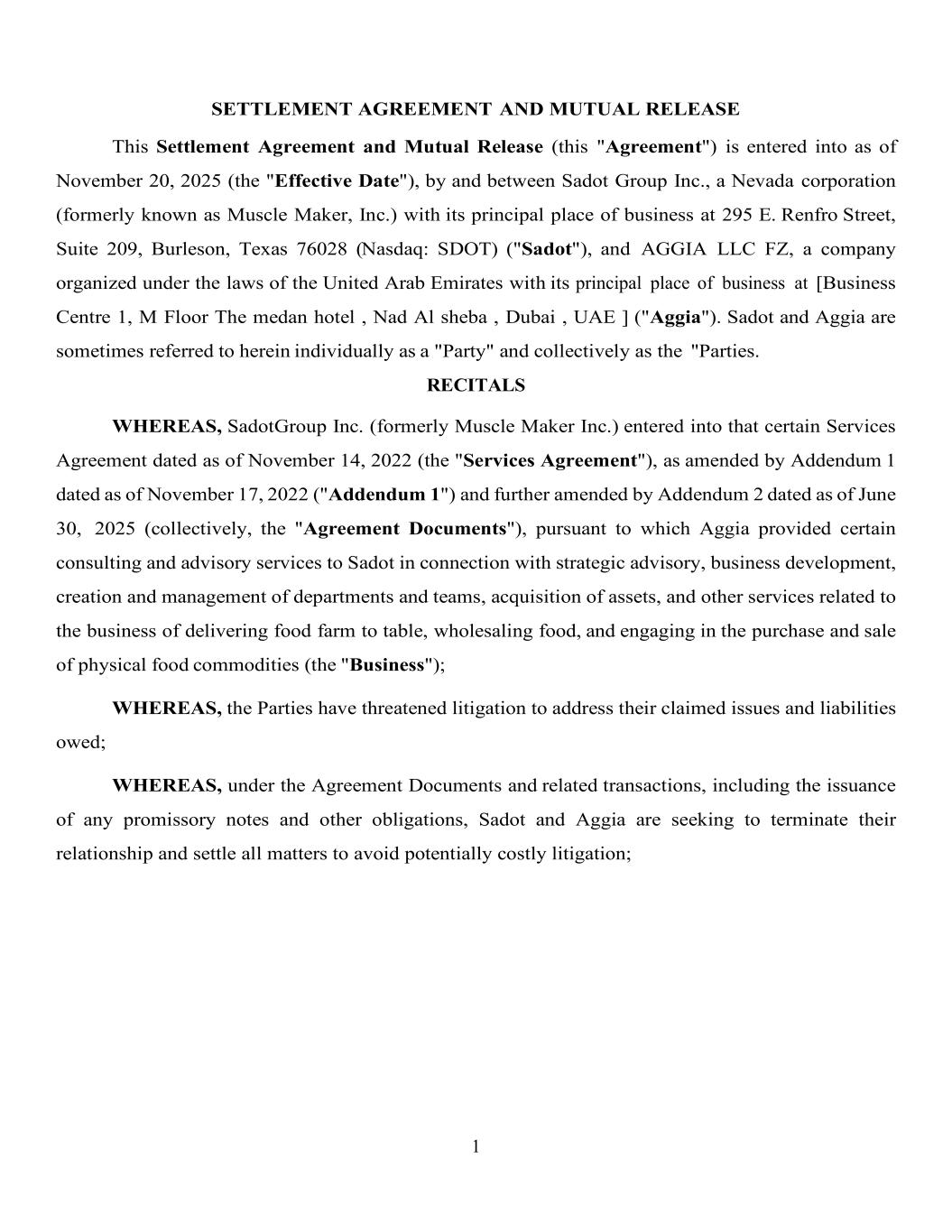 1 SETTLEMENT AGREEMENT AND MUTUAL RELEASE This Settlement Agreement and Mutual Release (this "Agreement") is entered into as of November 20, 2025 (the "Effective Date"), by and between Sadot Group Inc., a Nevada corporation (formerly known as Muscle Maker, Inc.) with its principal place of business at 295 E. Renfro Street, Suite 209, Burleson, Texas 76028 (Nasdaq: SDOT) ("Sadot"), and AGGIA LLC FZ, a company organized under the laws of the United Arab Emirates with its principal place of business at [Business Centre 1, M Floor The medan hotel , Nad Al sheba , Dubai , UAE ] ("Aggia"). Sadot and Aggia are sometimes referred to herein individually as a "Party" and collectively as the "Parties. RECITALS WHEREAS, SadotGroup Inc. (formerly Muscle Maker Inc.) entered into that certain Services Agreement dated as of November 14, 2022 (the "Services Agreement"), as amended by Addendum 1 dated as of November 17, 2022 ("Addendum 1") and further amended by Addendum 2 dated as of June 30, 2025 (collectively, the "Agreement Documents"), pursuant to which Aggia provided certain consulting and advisory services to Sadot in connection with strategic advisory, business development, creation and management of departments and teams, acquisition of assets, and other services related to the business of delivering food farm to table, wholesaling food, and engaging in the purchase and sale of physical food commodities (the "Business"); WHEREAS, the Parties have threatened litigation to address their claimed issues and liabilities owed; WHEREAS, under the Agreement Documents and related transactions, including the issuance of any promissory notes and other obligations, Sadot and Aggia are seeking to terminate their relationship and settle all matters to avoid potentially costly litigation;