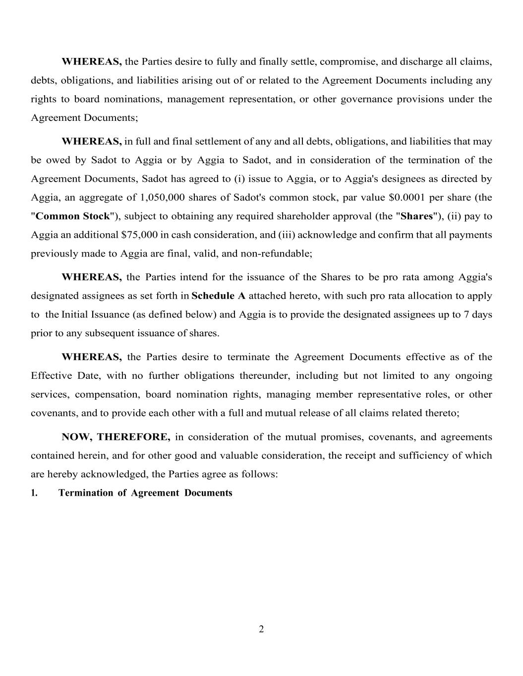 2 WHEREAS, the Parties desire to fully and finally settle, compromise, and discharge all claims, debts, obligations, and liabilities arising out of or related to the Agreement Documents including any rights to board nominations, management representation, or other governance provisions under the Agreement Documents; WHEREAS, in full and final settlement of any and all debts, obligations, and liabilities that may be owed by Sadot to Aggia or by Aggia to Sadot, and in consideration of the termination of the Agreement Documents, Sadot has agreed to (i) issue to Aggia, or to Aggia's designees as directed by Aggia, an aggregate of 1,050,000 shares of Sadot's common stock, par value $0.0001 per share (the "Common Stock"), subject to obtaining any required shareholder approval (the "Shares"), (ii) pay to Aggia an additional $75,000 in cash consideration, and (iii) acknowledge and confirm that all payments previously made to Aggia are final, valid, and non-refundable; WHEREAS, the Parties intend for the issuance of the Shares to be pro rata among Aggia's designated assignees as set forth in Schedule A attached hereto, with such pro rata allocation to apply to the Initial Issuance (as defined below) and Aggia is to provide the designated assignees up to 7 days prior to any subsequent issuance of shares. WHEREAS, the Parties desire to terminate the Agreement Documents effective as of the Effective Date, with no further obligations thereunder, including but not limited to any ongoing services, compensation, board nomination rights, managing member representative roles, or other covenants, and to provide each other with a full and mutual release of all claims related thereto; NOW, THEREFORE, in consideration of the mutual promises, covenants, and agreements contained herein, and for other good and valuable consideration, the receipt and sufficiency of which are hereby acknowledged, the Parties agree as follows: 1. Termination of Agreement Documents