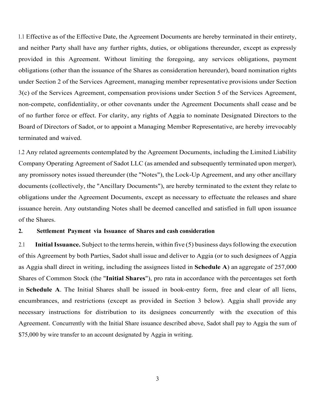 3 1.1 Effective as of the Effective Date, the Agreement Documents are hereby terminated in their entirety, and neither Party shall have any further rights, duties, or obligations thereunder, except as expressly provided in this Agreement. Without limiting the foregoing, any services obligations, payment obligations (other than the issuance of the Shares as consideration hereunder), board nomination rights under Section 2 of the Services Agreement, managing member representative provisions under Section 3(c) of the Services Agreement, compensation provisions under Section 5 of the Services Agreement, non-compete, confidentiality, or other covenants under the Agreement Documents shall cease and be of no further force or effect. For clarity, any rights of Aggia to nominate Designated Directors to the Board of Directors of Sadot, or to appoint a Managing Member Representative, are hereby irrevocably terminated and waived. 1.2 Any related agreements contemplated by the Agreement Documents, including the Limited Liability Company Operating Agreement of Sadot LLC (as amended and subsequently terminated upon merger), any promissory notes issued thereunder (the "Notes"), the Lock-Up Agreement, and any other ancillary documents (collectively, the "Ancillary Documents"), are hereby terminated to the extent they relate to obligations under the Agreement Documents, except as necessary to effectuate the releases and share issuance herein. Any outstanding Notes shall be deemed cancelled and satisfied in full upon issuance of the Shares. 2. Settlement Payment via Issuance of Shares and cash consideration 2.1 Initial Issuance. Subject to the terms herein, within five (5) business days following the execution of this Agreement by both Parties, Sadot shall issue and deliver to Aggia (or to such designees of Aggia as Aggia shall direct in writing, including the assignees listed in Schedule A) an aggregate of 257,000 Shares of Common Stock (the "Initial Shares"), pro rata in accordance with the percentages set forth in Schedule A. The Initial Shares shall be issued in book-entry form, free and clear of all liens, encumbrances, and restrictions (except as provided in Section 3 below). Aggia shall provide any necessary instructions for distribution to its designees concurrently with the execution of this Agreement. Concurrently with the Initial Share issuance described above, Sadot shall pay to Aggia the sum of $75,000 by wire transfer to an account designated by Aggia in writing.