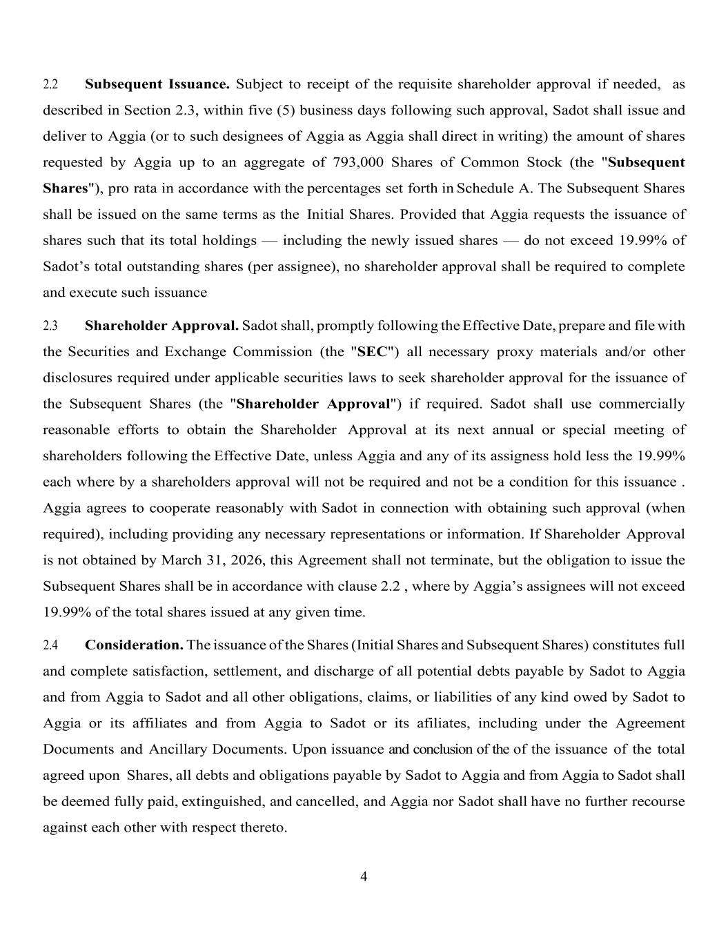 4 2.2 Subsequent Issuance. Subject to receipt of the requisite shareholder approval if needed, as described in Section 2.3, within five (5) business days following such approval, Sadot shall issue and deliver to Aggia (or to such designees of Aggia as Aggia shall direct in writing) the amount of shares requested by Aggia up to an aggregate of 793,000 Shares of Common Stock (the "Subsequent Shares"), pro rata in accordance with the percentages set forth in Schedule A. The Subsequent Shares shall be issued on the same terms as the Initial Shares. Provided that Aggia requests the issuance of shares such that its total holdings — including the newly issued shares — do not exceed 19.99% of Sadot’s total outstanding shares (per assignee), no shareholder approval shall be required to complete and execute such issuance 2.3 Shareholder Approval. Sadot shall, promptly following the Effective Date, prepare and file with the Securities and Exchange Commission (the "SEC") all necessary proxy materials and/or other disclosures required under applicable securities laws to seek shareholder approval for the issuance of the Subsequent Shares (the "Shareholder Approval") if required. Sadot shall use commercially reasonable efforts to obtain the Shareholder Approval at its next annual or special meeting of shareholders following the Effective Date, unless Aggia and any of its assigness hold less the 19.99% each where by a shareholders approval will not be required and not be a condition for this issuance . Aggia agrees to cooperate reasonably with Sadot in connection with obtaining such approval (when required), including providing any necessary representations or information. If Shareholder Approval is not obtained by March 31, 2026, this Agreement shall not terminate, but the obligation to issue the Subsequent Shares shall be in accordance with clause 2.2 , where by Aggia’s assignees will not exceed 19.99% of the total shares issued at any given time. 2.4 Consideration. The issuance of the Shares (Initial Shares and Subsequent Shares) constitutes full and complete satisfaction, settlement, and discharge of all potential debts payable by Sadot to Aggia and from Aggia to Sadot and all other obligations, claims, or liabilities of any kind owed by Sadot to Aggia or its affiliates and from Aggia to Sadot or its afiliates, including under the Agreement Documents and Ancillary Documents. Upon issuance and conclusion of the of the issuance of the total agreed upon Shares, all debts and obligations payable by Sadot to Aggia and from Aggia to Sadot shall be deemed fully paid, extinguished, and cancelled, and Aggia nor Sadot shall have no further recourse against each other with respect thereto.