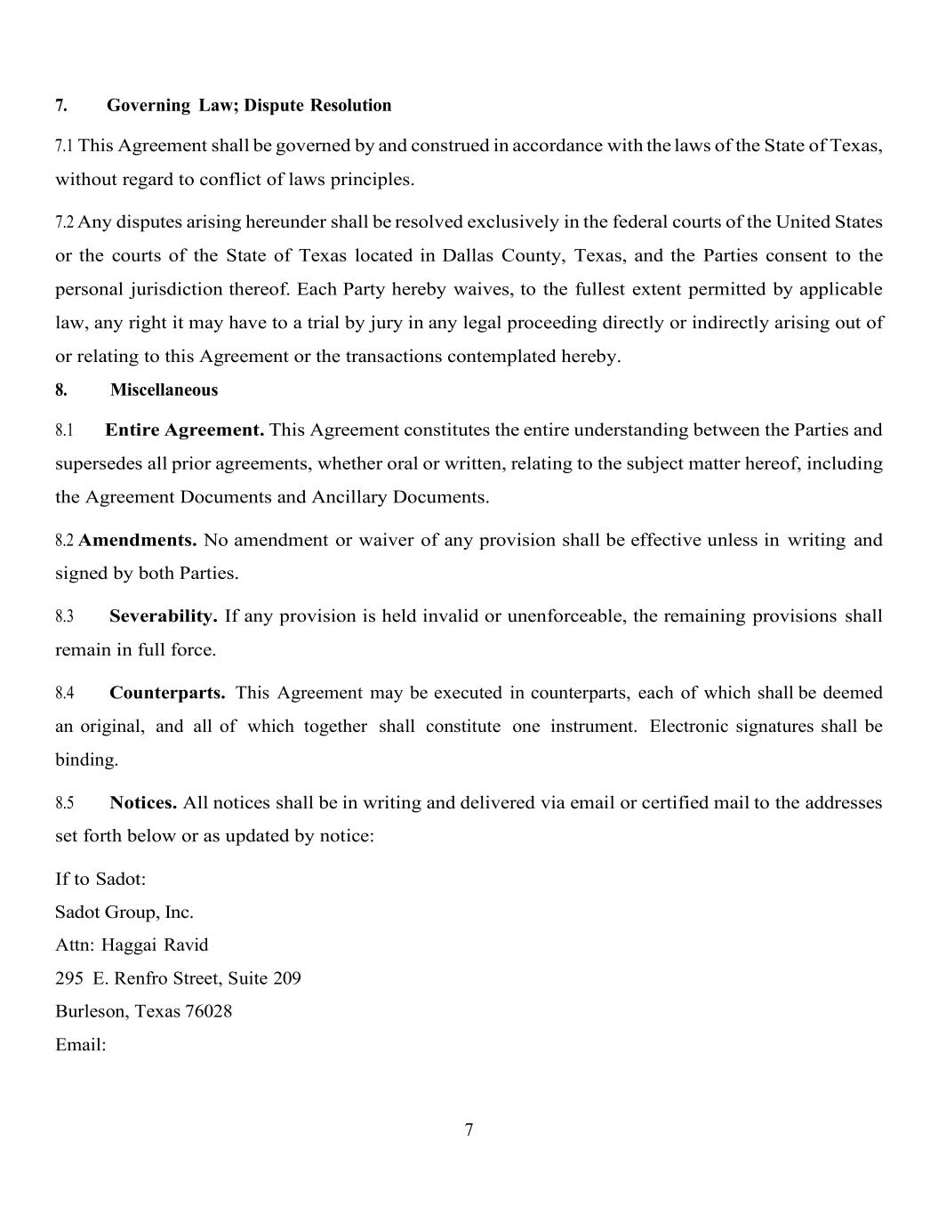 7 7. Governing Law; Dispute Resolution 7.1 This Agreement shall be governed by and construed in accordance with the laws of the State of Texas, without regard to conflict of laws principles. 7.2 Any disputes arising hereunder shall be resolved exclusively in the federal courts of the United States or the courts of the State of Texas located in Dallas County, Texas, and the Parties consent to the personal jurisdiction thereof. Each Party hereby waives, to the fullest extent permitted by applicable law, any right it may have to a trial by jury in any legal proceeding directly or indirectly arising out of or relating to this Agreement or the transactions contemplated hereby. 8. Miscellaneous 8.1 Entire Agreement. This Agreement constitutes the entire understanding between the Parties and supersedes all prior agreements, whether oral or written, relating to the subject matter hereof, including the Agreement Documents and Ancillary Documents. 8.2 Amendments. No amendment or waiver of any provision shall be effective unless in writing and signed by both Parties. 8.3 Severability. If any provision is held invalid or unenforceable, the remaining provisions shall remain in full force. 8.4 Counterparts. This Agreement may be executed in counterparts, each of which shall be deemed an original, and all of which together shall constitute one instrument. Electronic signatures shall be binding. 8.5 Notices. All notices shall be in writing and delivered via email or certified mail to the addresses set forth below or as updated by notice: If to Sadot: Sadot Group, Inc. Attn: Haggai Ravid 295 E. Renfro Street, Suite 209 Burleson, Texas 76028 Email: