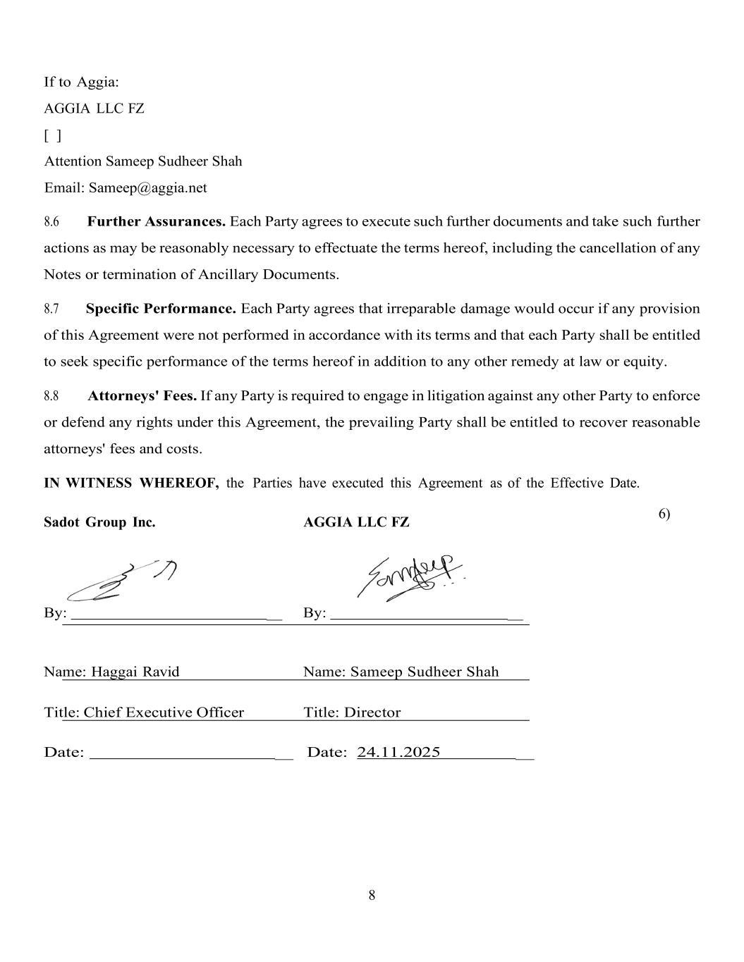 8 If to Aggia: AGGIA LLC FZ [ ] Attention Sameep Sudheer Shah Email: Sameep@aggia.net 8.6 Further Assurances. Each Party agrees to execute such further documents and take such further actions as may be reasonably necessary to effectuate the terms hereof, including the cancellation of any Notes or termination of Ancillary Documents. 8.7 Specific Performance. Each Party agrees that irreparable damage would occur if any provision of this Agreement were not performed in accordance with its terms and that each Party shall be entitled to seek specific performance of the terms hereof in addition to any other remedy at law or equity. 8.8 Attorneys' Fees. If any Party is required to engage in litigation against any other Party to enforce or defend any rights under this Agreement, the prevailing Party shall be entitled to recover reasonable attorneys' fees and costs. IN WITNESS WHEREOF, the Parties have executed this Agreement as of the Effective Date. Sadot Group Inc. AGGIA LLC FZ 6) By: _ By: _ Name: Haggai Ravid Name: Sameep Sudheer Shah Title: Chief Executive Officer Title: Director Date: _ Date: 24.11.2025 _
