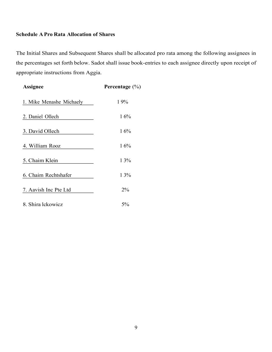 9 Schedule A Pro Rata Allocation of Shares The Initial Shares and Subsequent Shares shall be allocated pro rata among the following assignees in the percentages set forth below. Sadot shall issue book-entries to each assignee directly upon receipt of appropriate instructions from Aggia. Assignee 1. Mike Menashe Michaely Percentage (%) 1 9% 2. Daniel Ollech 1 6% 3. David Ollech 1 6% 4. William Rooz 1 6% 5. Chaim Klein 1 3% 6. Chaim Rechtshafer 1 3% 7. Aavish Inc Pte Ltd 2% 8. Shira lckowicz 5%