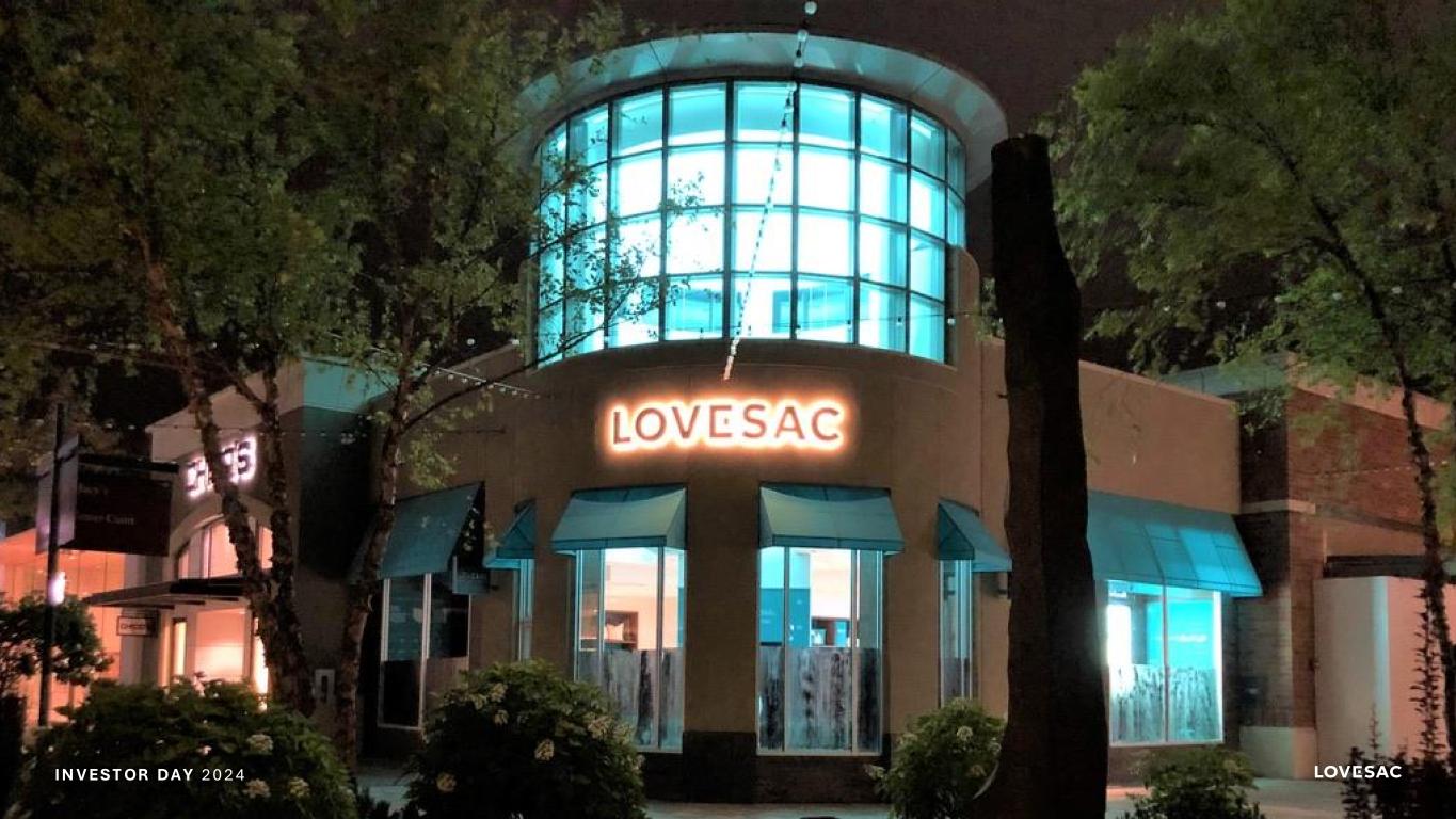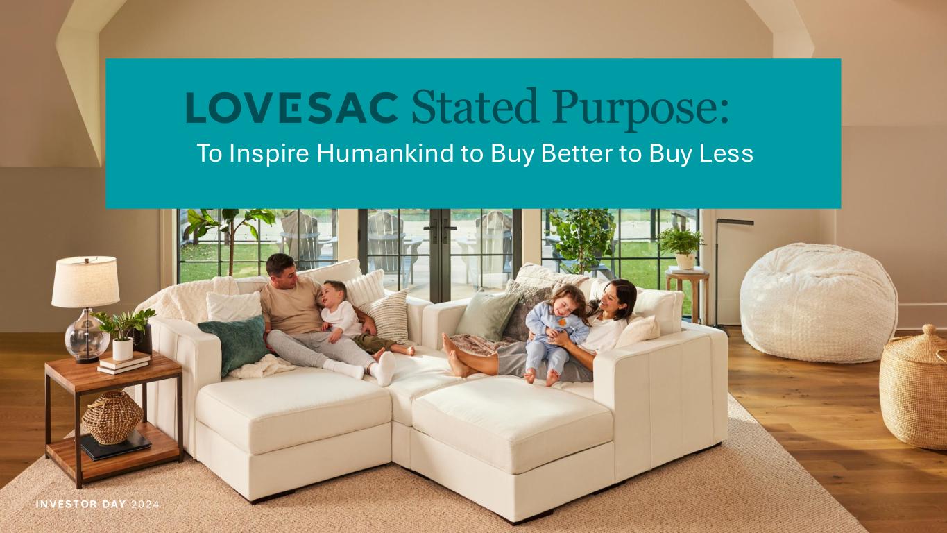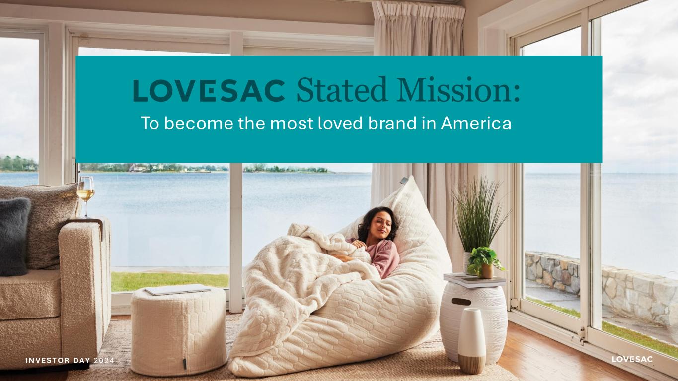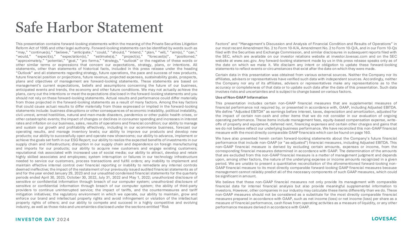 I N V ES T OR DA Y 2 0 2 4 Safe Harbor Statement This presentation contains forward-looking statements within the meaning of the Private Securities Litigation Reform Act of 1995 and other legal authority. Forward-looking statements can be identified by words such as “may,” “continue(s),” “believe,” “anticipate,” “could,” “should,” “intend,” “plan,” “will,” “aim(s),” “can,” “would,” “expect(s),” “expectation(s),” “estimate(s),” “project(s),” “forecast(s)”, “positioned,” “approximately,” “potential,” “goal,” “pro forma,” “strategy,” “outlook” or the negative of these words or other similar terms or expressions that concern our expectations, strategy, plans, or intentions. All statements, other than statements of historical facts, included in this press release under the heading “Outlook” and all statements regarding strategy, future operations, the pace and success of new products, future financial position or projections, future revenue, projected expenses, sustainability goals, prospects, plans and objectives of management are forward-looking statements. These statements are based on management’s current expectations, beliefs and assumptions concerning the future of our business, anticipated events and trends, the economy and other future conditions. We may not actually achieve the plans, carry out the intentions or meet the expectations disclosed in the forward-looking statements and you should not rely on these forward-looking statements. Actual results and performance could differ materially from those projected in the forward-looking statements as a result of many factors. Among the key factors that could cause actual results to differ materially from those expressed or implied in the forward-looking statements include: business disruptions or other consequences of economic instability, political instability, civil unrest, armed hostilities, natural and man-made disasters, pandemics or other public health crises, or other catastrophic events; the impact of changes or declines in consumer spending and increases in interest rates and inflation on our business, sales, results of operations and financial condition; our ability to manage and sustain our growth and profitability effectively, including in our ecommerce business, forecast our operating results, and manage inventory levels; our ability to improve our products and develop new products; our ability to successfully open and operate new showrooms; our ability to advance, implement or achieve the goals set forth in our ESG Report; our ability to realize the expected benefits of investments in our supply chain and infrastructure; disruption in our supply chain and dependence on foreign manufacturing and imports for our products; our ability to acquire new customers and engage existing customers; reputational risk associated with increased use of social media; our ability to attract, develop and retain highly skilled associates and employees; system interruption or failures in our technology infrastructure needed to service our customers, process transactions and fulfill orders; any inability to implement and maintain effective internal control over financial reporting or inability to remediate any internal controls deemed ineffective; the impact of the restatement of our previously issued audited financial statements as of and for the year ended January 29, 2023 and our unaudited condensed financial statements for the quarterly periods ended April 30, 2023, October 30, 2022, July 31, 2022 and May 1, 2022; unauthorized disclosure of sensitive or confidential information through breach of our computer system; unauthorized disclosure of sensitive or confidential information through breach of our computer system; the ability of third-party providers to continue uninterrupted service; the impact of tariffs, and the countermeasures and tariff mitigation initiatives; the regulatory environment in which we operate, our ability to maintain, grow and enforce our brand and intellectual property rights and avoid infringement or violation of the intellectual property rights of others; and our ability to compete and succeed in a highly competitive and evolving industry, as well as those risks and uncertainties disclosed under the sections entitled “Risk Factors” and “Management’s Discussion and Analysis of Financial Condition and Results of Operations” in our most recent Amendment No. 2 to Form 10-K/A, Amendment No. 2 to Form 10-Q/A, and in our Form 10-Qs filed with the Securities and Exchange Commission, and similar disclosures in subsequent reports filed with the SEC, which are available on our investor relations website at investor.lovesac.com and on the SEC website at www.sec.gov. Any forward-looking statement made by us in this press release speaks only as of the date on which we make it. We disclaim any intent or obligation to update these forward-looking statements to reflect events or circumstances that exist after the date on which they were made. Certain data in this presentation was obtained from various external sources. Neither the Company nor its affiliates, advisers or representatives have verified such data with independent sources. Accordingly, neither the Company nor any of its affiliates, advisers or representatives make any representations as to the accuracy or completeness of that data or to update such data after the date of this presentation. Such data involves risks and uncertainties and is subject to change based on various factors. Use of Non-GAAP Information This presentation includes certain non-GAAP financial measures that are supplemental measures of financial performance not required by, or presented in accordance with, GAAP, including Adjusted EBITDA. We define “Adjusted EBITDA” as earnings before interest, taxes, depreciation and amortization, adjusted for the impact of certain non-cash and other it