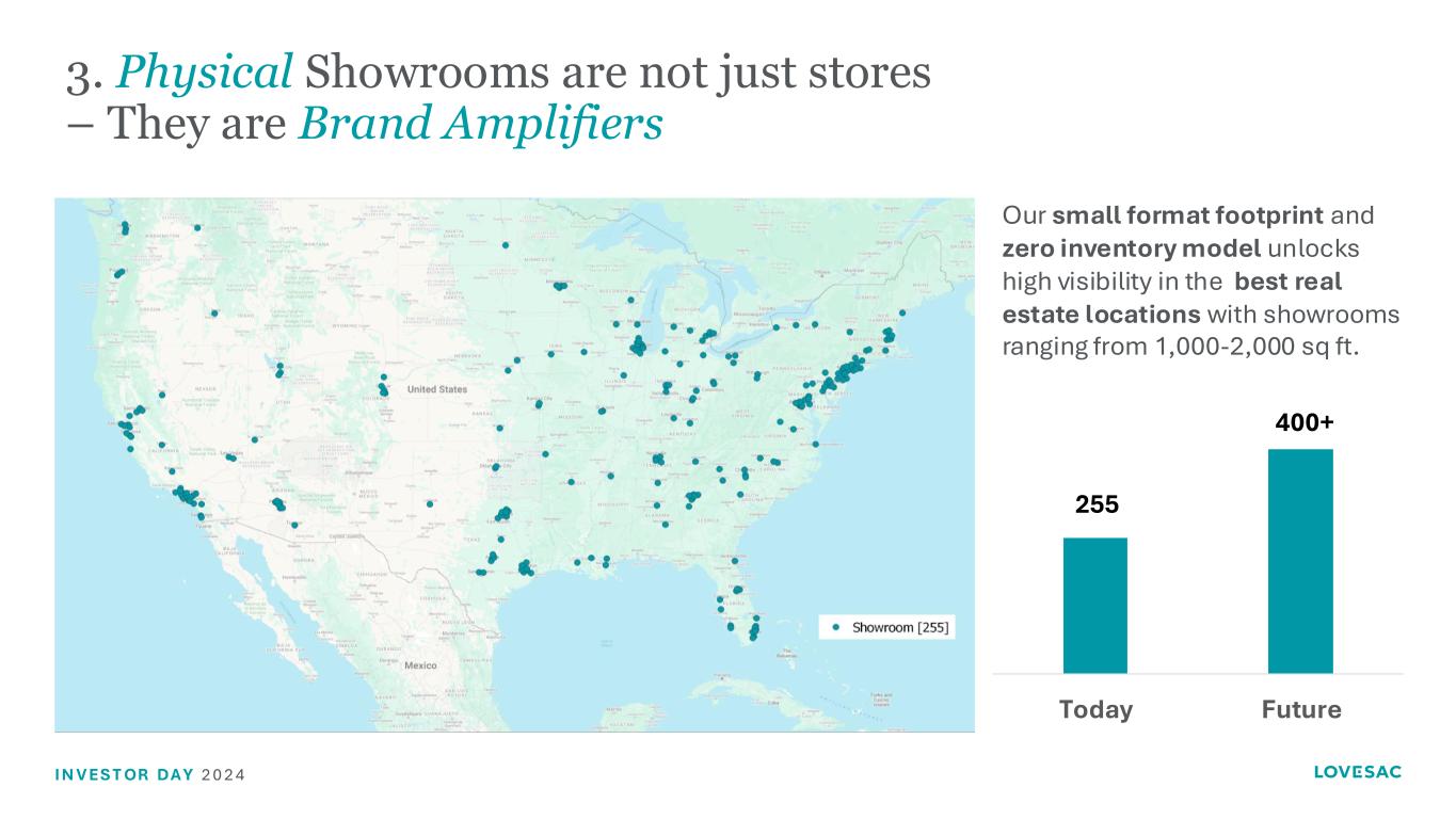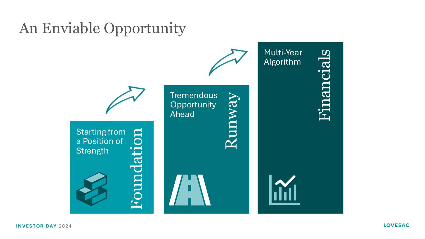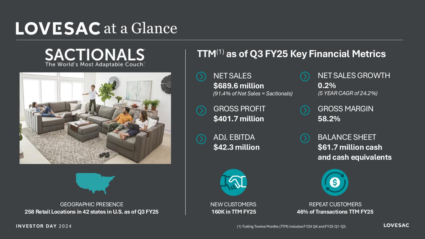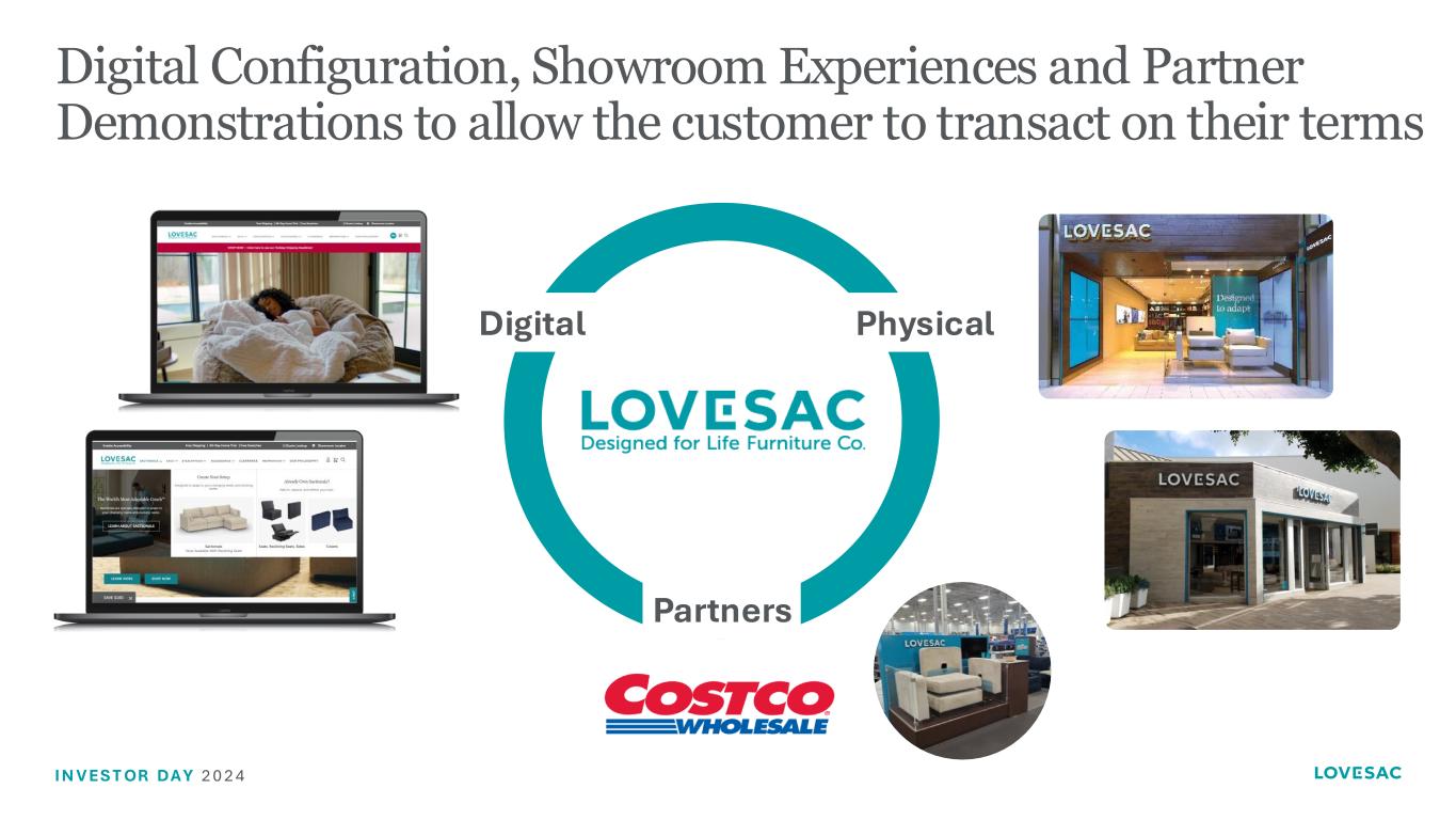 I N V ES T OR DA Y 2 0 2 4 Safe Harbor Statement This presentation contains forward-looking statements within the meaning of the Private Securities Litigation Reform Act of 1995 and other legal authority. Forward-looking statements can be identified by words such as “may,” “continue(s),” “believe,” “anticipate,” “could,” “should,” “intend,” “plan,” “will,” “aim(s),” “can,” “would,” “expect(s),” “expectation(s),” “estimate(s),” “project(s),” “forecast(s)”, “positioned,” “approximately,” “potential,” “goal,” “pro forma,” “strategy,” “outlook” or the negative of these words or other similar terms or expressions that concern our expectations, strategy, plans, or intentions. All statements, other than statements of historical facts, included in this press release under the heading “Outlook” and all statements regarding strategy, future operations, the pace and success of new products, future financial position or projections, future revenue, projected expenses, sustainability goals, prospects, plans and objectives of management are forward-looking statements. These statements are based on management’s current expectations, beliefs and assumptions concerning the future of our business, anticipated events and trends, the economy and other future conditions. We may not actually achieve the plans, carry out the intentions or meet the expectations disclosed in the forward-looking statements and you should not rely on these forward-looking statements. Actual results and performance could differ materially from those projected in the forward-looking statements as a result of many factors. Among the key factors that could cause actual results to differ materially from those expressed or implied in the forward-looking statements include: business disruptions or other consequences of economic instability, political instability, civil unrest, armed hostilities, natural and man-made disasters, pandemics or other public health crises, or other catastrophic events; the impact of changes or declines in consumer spending and increases in interest rates and inflation on our business, sales, results of operations and financial condition; our ability to manage and sustain our growth and profitability effectively, including in our ecommerce business, forecast our operating results, and manage inventory levels; our ability to improve our products and develop new products; our ability to successfully open and operate new showrooms; our ability to advance, implement or achieve the goals set forth in our ESG Report; our ability to realize the expected benefits of investments in our supply chain and infrastructure; disruption in our supply chain and dependence on foreign manufacturing and imports for our products; our ability to acquire new customers and engage existing customers; reputational risk associated with increased use of social media; our ability to attract, develop and retain highly skilled associates and employees; system interruption or failures in our technology infrastructure needed to service our customers, process transactions and fulfill orders; any inability to implement and maintain effective internal control over financial reporting or inability to remediate any internal controls deemed ineffective; the impact of the restatement of our previously issued audited financial statements as of and for the year ended January 29, 2023 and our unaudited condensed financial statements for the quarterly periods ended April 30, 2023, October 30, 2022, July 31, 2022 and May 1, 2022; unauthorized disclosure of sensitive or confidential information through breach of our computer system; unauthorized disclosure of sensitive or confidential information through breach of our computer system; the ability of third-party providers to continue uninterrupted service; the impact of tariffs, and the countermeasures and tariff mitigation initiatives; the regulatory environment in which we operate, our ability to maintain, grow and enforce our brand and intellectual property rights and avoid infringement or violation of the intellectual property rights of others; and our ability to compete and succeed in a highly competitive and evolving industry, as well as those risks and uncertainties disclosed under the sections entitled “Risk Factors” and “Management’s Discussion and Analysis of Financial Condition and Results of Operations” in our most recent Amendment No. 2 to Form 10-K/A, Amendment No. 2 to Form 10-Q/A, and in our Form 10-Qs filed with the Securities and Exchange Commission, and similar disclosures in subsequent reports filed with the SEC, which are available on our investor relations website at investor.lovesac.com and on the SEC website at www.sec.gov. Any forward-looking statement made by us in this press release speaks only as of the date on which we make it. We disclaim any intent or obligation to update these forward-looking statements to reflect events or circumstances that exist after the date on which they were made. Certain data in this presentation was obtained from various external sources. Neither the Company nor its affiliates, advisers or representatives have verified such data with independent sources. Accordingly, neither the Company nor any of its affiliates, advisers or representatives make any representations as to the accuracy or completeness of that data or to update such data after the date of this presentation. Such data involves risks and uncertainties and is subject to change based on various factors. Use of Non-GAAP Information This presentation includes certain non-GAAP financial measures that are supplemental measures of financial performance not required by, or presented in accordance with, GAAP, including Adjusted EBITDA. We define “Adjusted EBITDA” as earnings before interest, taxes, depreciation and amortization, adjusted for the impact of certain non-cash and other it