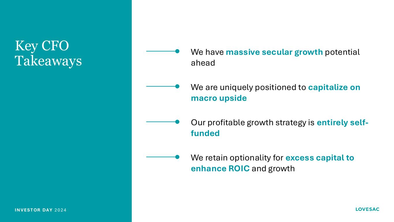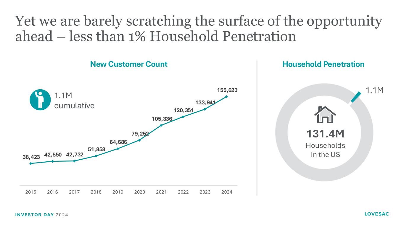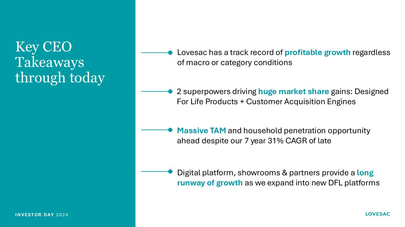 I N V ES T OR DA Y 2 0 2 4 Key CEO Takeaways through today Lovesac has a track record of profitable growth regardless of macro or category conditions 2 superpowers driving huge market share gains: Designed For Life Products + Customer Acquisition Engines Massive TAM and household penetration opportunity ahead despite our 7 year 31% CAGR of late Digital platform, showrooms & partners provide a long runway of growth as we expand into new DFL platforms