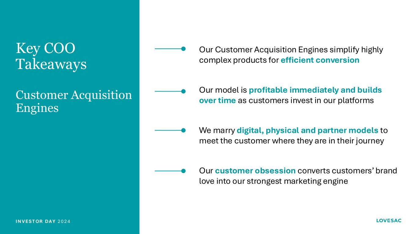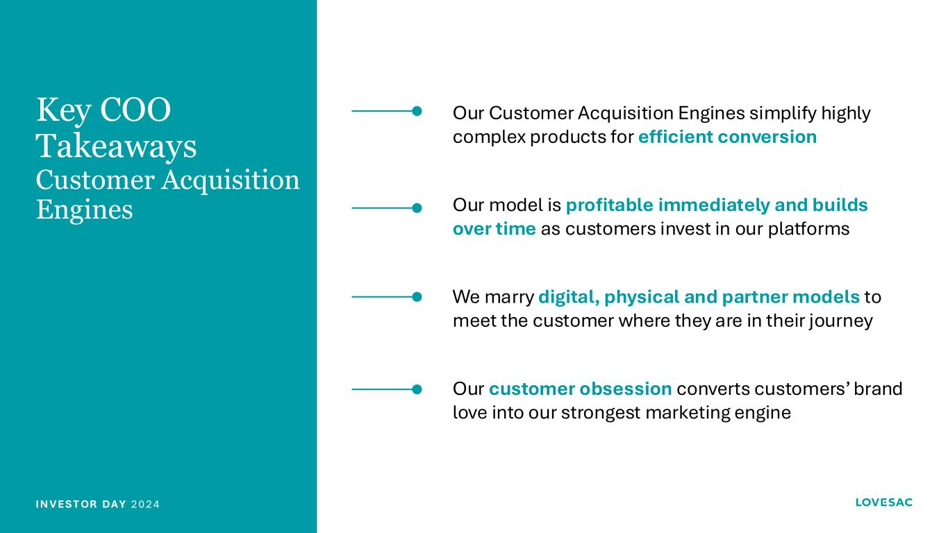 I N V ES T OR DA Y 2 0 2 4 Our model is profitable immediately and builds over time as customers invest in our platforms Our Customer Acquisition Engines simplify highly complex products for efficient conversion We marry digital, physical and partner models to meet the customer where they are in their journey Key COO Takeaways Customer Acquisition Engines Our customer obsession converts customers’ brand love into our strongest marketing engine
