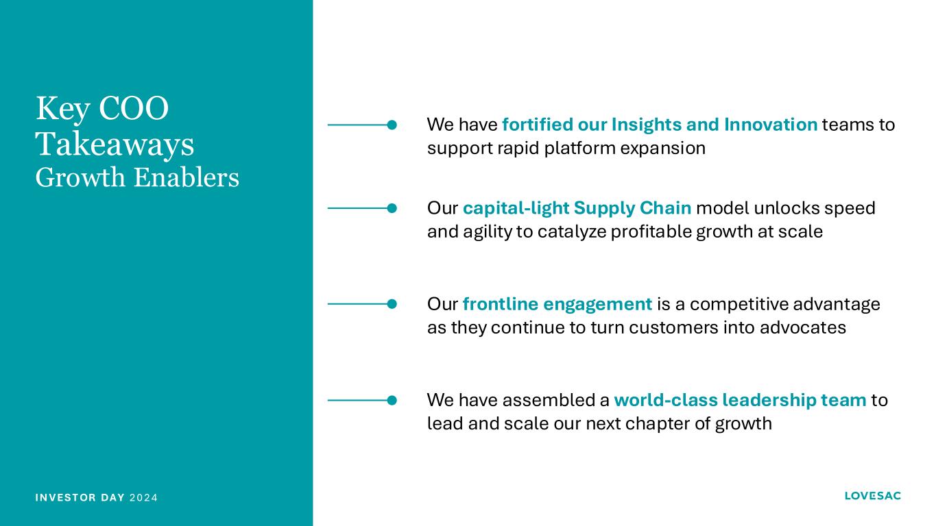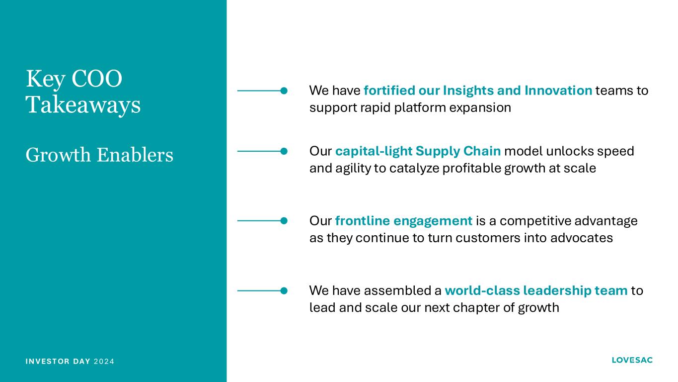 I N V ES T OR DA Y 2 0 2 4 Our capital-light Supply Chain model unlocks speed and agility to catalyze profitable growth at scale We have assembled a world-class leadership team to lead and scale our next chapter of growth We have fortified our Insights and Innovation teams to support rapid platform expansion Our frontline engagement is a competitive advantage as they continue to turn customers into advocates Key COO Takeaways Growth Enablers