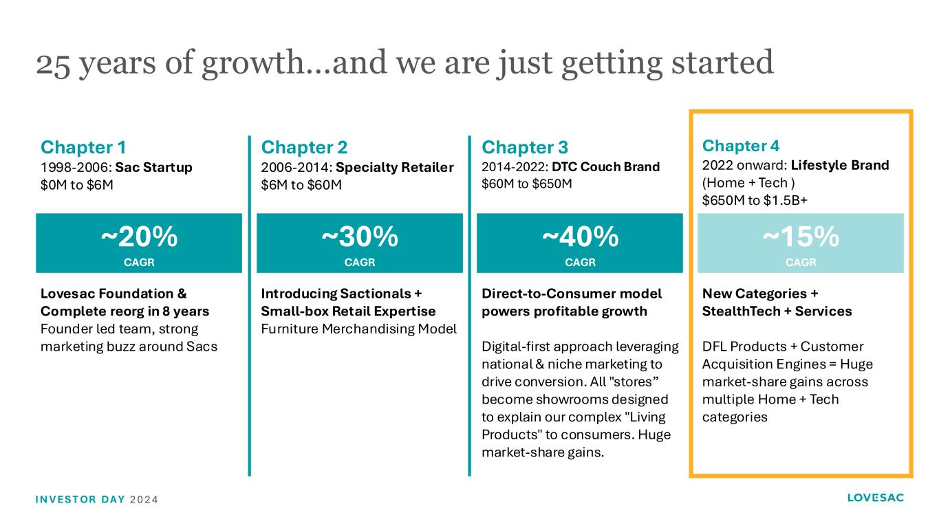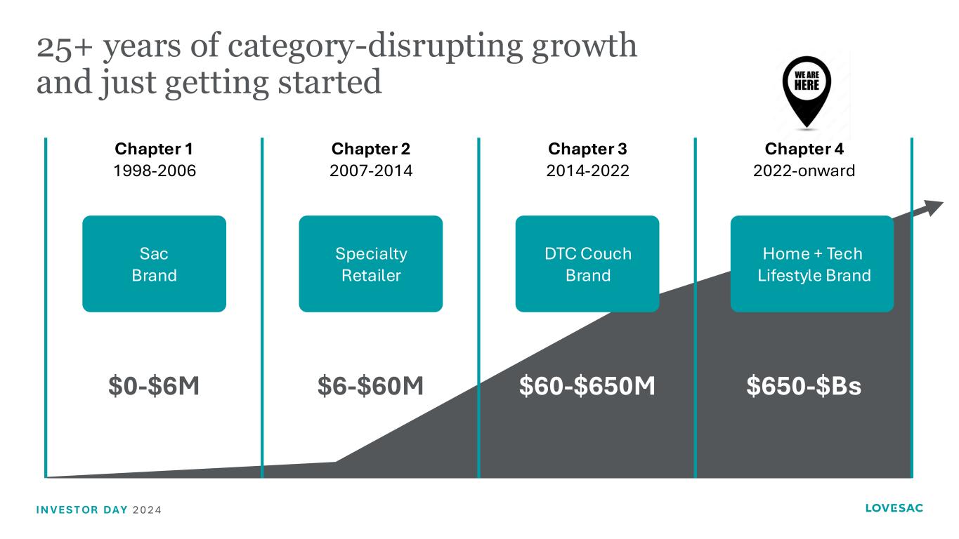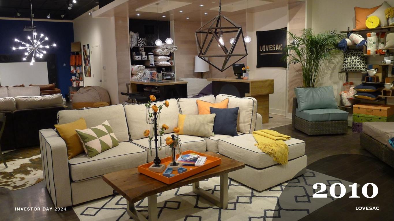 I N V ES T OR DA Y 2 0 2 4 25+ years of category-disrupting growth and just getting started Chapter 1 1998-2006 Chapter 2 2007-2014 Chapter 3 2014-2022 Chapter 4 2022-onward Sac Brand $0-$6M $6-$60M $60-$650M $650-$Bs Specialty Retailer DTC Couch Brand Home + Tech Lifestyle Brand