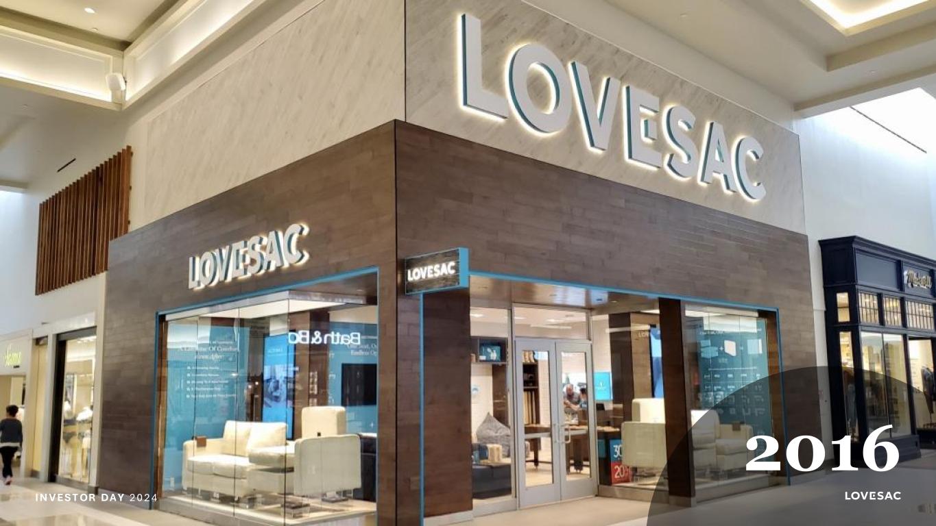 I N V ES T OR DA Y 2 0 2 4 25 years of growth…and we are just getting started Chapter 1 1998-2006: Sac Startup $0M to $6M Chapter 2 2006-2014: Specialty Retailer $6M to $60M Chapter 3 2014-2022: DTC Couch Brand $60M to $650M Chapter 4 2022 onward: Lifestyle Brand (Home + Tech ) $650M to $1.5B+ ~20% CAGR ~30% CAGR ~40% CAGR ~15% CAGR New Categories + StealthTech + Services DFL Products + Customer Acquisition Engines = Huge market-share gains across multiple Home + Tech categories Direct-to-Consumer model powers profitable growth Digital-first approach leveraging national & niche marketing to drive conversion. All "stores” become showrooms designed to explain our complex "Living Products" to consumers. Huge market-share gains. Introducing Sactionals + Small-box Retail Expertise Furniture Merchandising Model Lovesac Foundation & Complete reorg in 8 years Founder led team, strong marketing buzz around Sacs