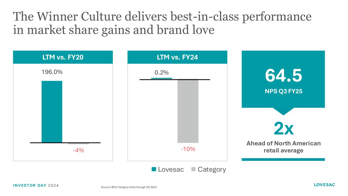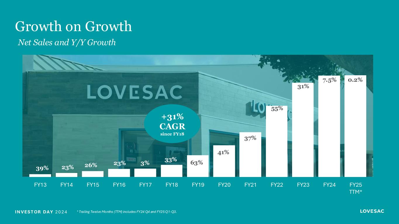 I N V ES T OR DA Y 2 0 2 4 The Winner Culture delivers best-in-class performance in market share gains and brand love 64.5 NPS Q3 FY25 2x Ahead of North American retail average 0.2% -10% 196.0% -4% LTM vs. FY20 LTM vs. FY24 Lovesac Category Source: BOA Category Data through Q3 2024