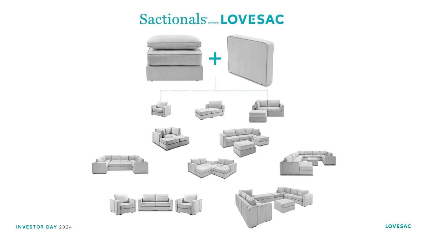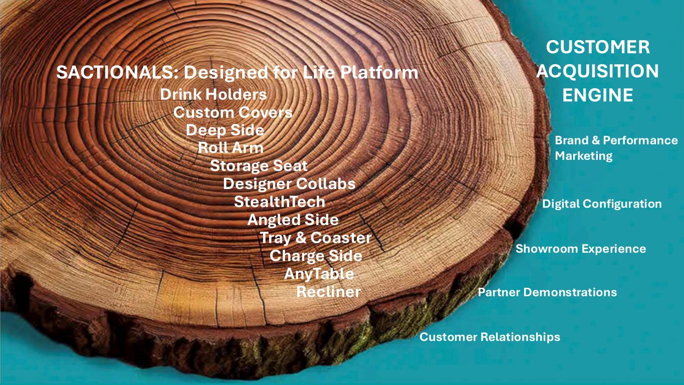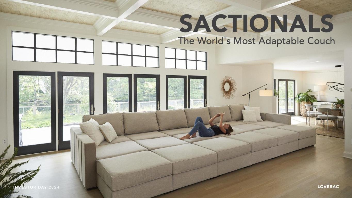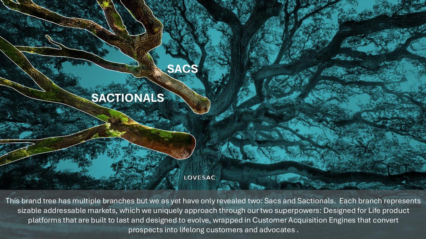 I N V ES T OR DA Y 2 0 2 4 SACTIONALS SACS This brand tree has multiple branches but we as yet have only revealed two: Sacs and Sactionals. Each branch represents sizable addressable markets, which we uniquely approach through our two superpowers: Designed for Life product platforms that are built to last and designed to evolve, wrapped in Customer Acquisition Engines that convert prospects into lifelong customers and advocates .