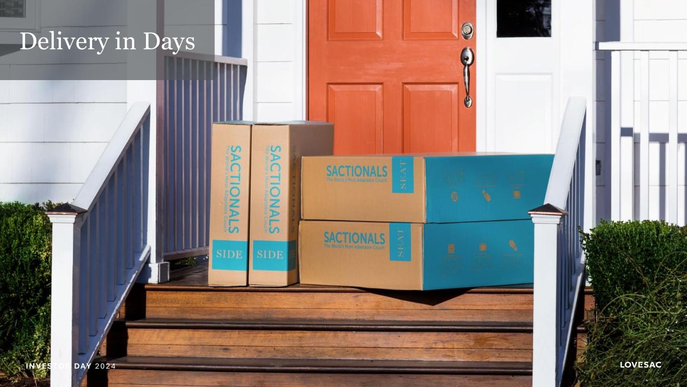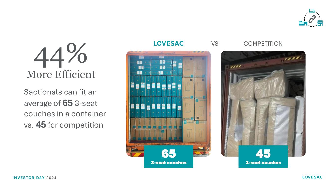 I N V ES T OR DA Y 2 0 2 4 44% More Efficient Sactionals can fit an average of 65 3-seat couches in a container vs. 45 for competition COMPETITION 65 3-seat couches VS 45 3-seat couches