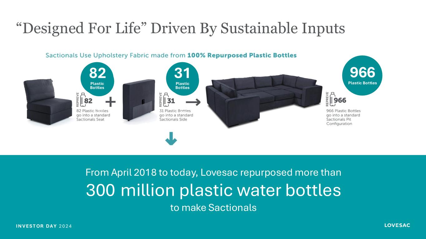 I N V ES T OR DA Y 2 0 2 4 “Designed For Life” Driven By Sustainable Inputs 82 3 1 Plastic Plastic Bottles Bottles 966 Plastic Bottles 82 Plastic Bottles 31 Plastic Bottles From April 2018 to today, Lovesac repurposed more than 300 million plastic water bottles to make Sactionals
