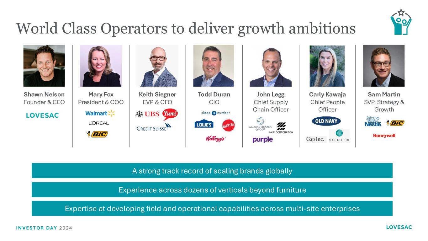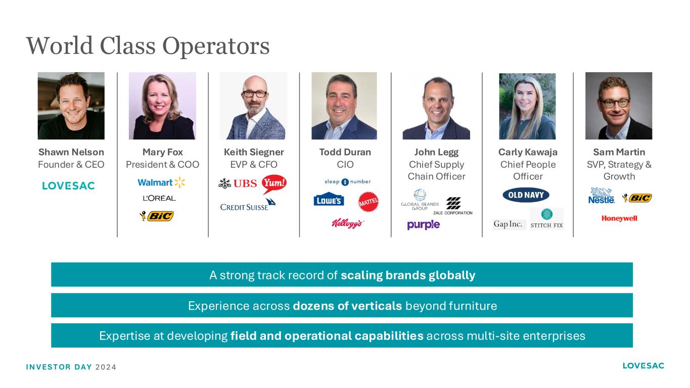 I N V ES T OR DA Y 2 0 2 4 World Class Operators Shawn Nelson Founder & CEO Keith Siegner EVP & CFO Mary Fox President & COO Todd Duran CIO John Legg Chief Supply Chain Officer Carly Kawaja Chief People Officer Sam Martin SVP, Strategy & Growth A strong track record of scaling brands globally Experience across dozens of verticals beyond furniture Expertise at developing field and operational capabilities across multi-site enterprises