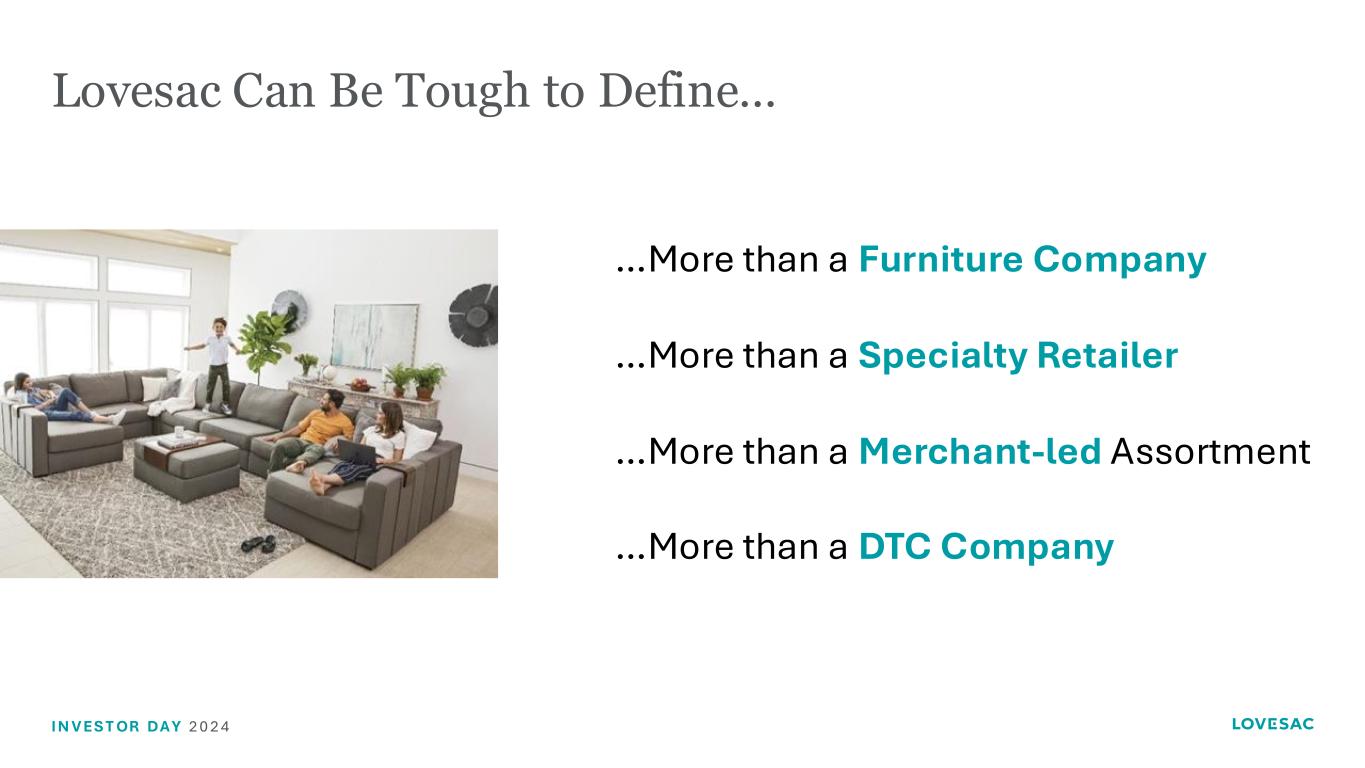 I N V ES T OR DA Y 2 0 2 4 Lovesac Can Be Tough to Define… …More than a Furniture Company …More than a Specialty Retailer …More than a Merchant-led Assortment …More than a DTC Company