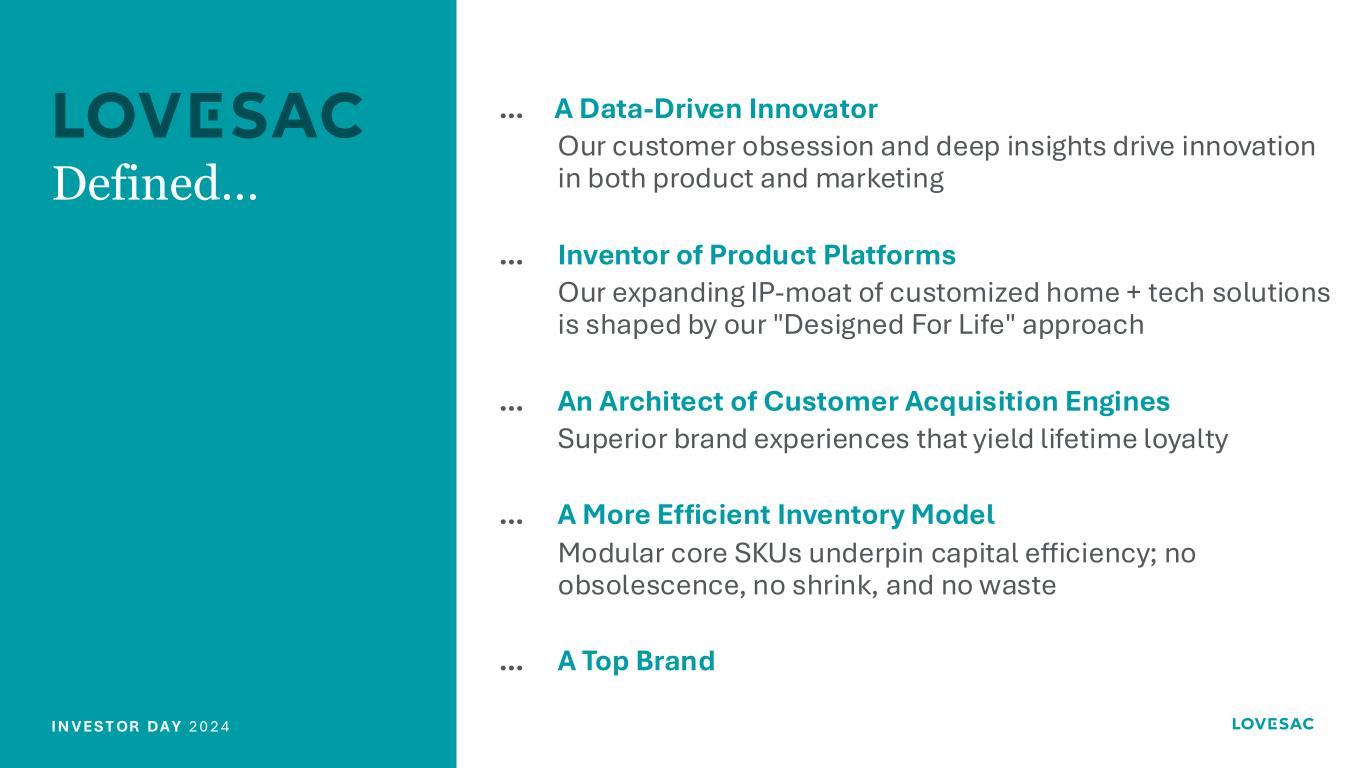 I N V ES T OR DA Y 2 0 2 4 Defined… … A Data-Driven Innovator Our customer obsession and deep insights drive innovation in both product and marketing … Inventor of Product Platforms Our expanding IP-moat of customized home + tech solutions is shaped by our "Designed For Life" approach … An Architect of Customer Acquisition Engines Superior brand experiences that yield lifetime loyalty … A More Efficient Inventory Model Modular core SKUs underpin capital efficiency; no obsolescence, no shrink, and no waste … A Top Brand