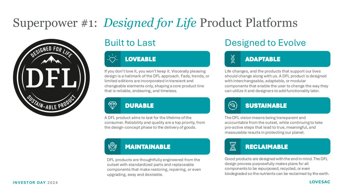 I N V ES T OR DA Y 2 0 2 4 If you don’t love it, you won’t keep it. Viscerally pleasing design is a hallmark of the DFL approach. Fads, trends, or limited editions are incorporated in transient and changeable elements only, shaping a core product line that is reliable, endearing, and timeless. Built to Last Designed to Evolve A DFL product aims to last for the lifetime of the consumer. Reliability and quality are a top priority, from the design-concept phase to the delivery of goods. LOVEABLE DURABLE MAINTAINABLE Life changes, and the products that support our lives should change along with us. A DFL product is designed with interchangeable, adaptable, or modular components that enable the user to change the way they can utilize it and designers to add functionality later. ADAPTABLE The DFL vision means being transparent and accountable from the outset, while continuing to take pro-active steps that lead to true, meaningful, and measurable results in protecting our planet. SUSTAINABLE Good products are designed with the end in mind. The DFL design process purposefully makes plans for all components to be repurposed, recycled, or even biodegraded so the nutrients can be reclaimed by the earth. RECLAIMABLE Superpower #1: Designed for Life Product Platforms DFL products are thoughtfully engineered from the outset with standardized parts and replaceable components that make restoring, repairing, or even upgrading, easy and desirable.