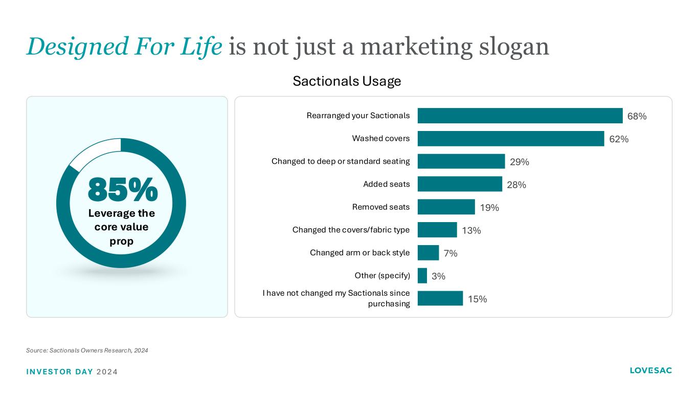I N V ES T OR DA Y 2 0 2 4 Designed For Life is not just a marketing slogan Source: Sactionals Owners Research, 2024 Sactionals Usage 68% 62% 29% 28% 19% 13% 7% 3% 15% Rearranged your Sactionals Washed covers Changed to deep or standard seating Added seats Removed seats Changed the covers/fabric type Changed arm or back style Other (specify) I have not changed my Sactionals since purchasing 85% Leverage the core value prop