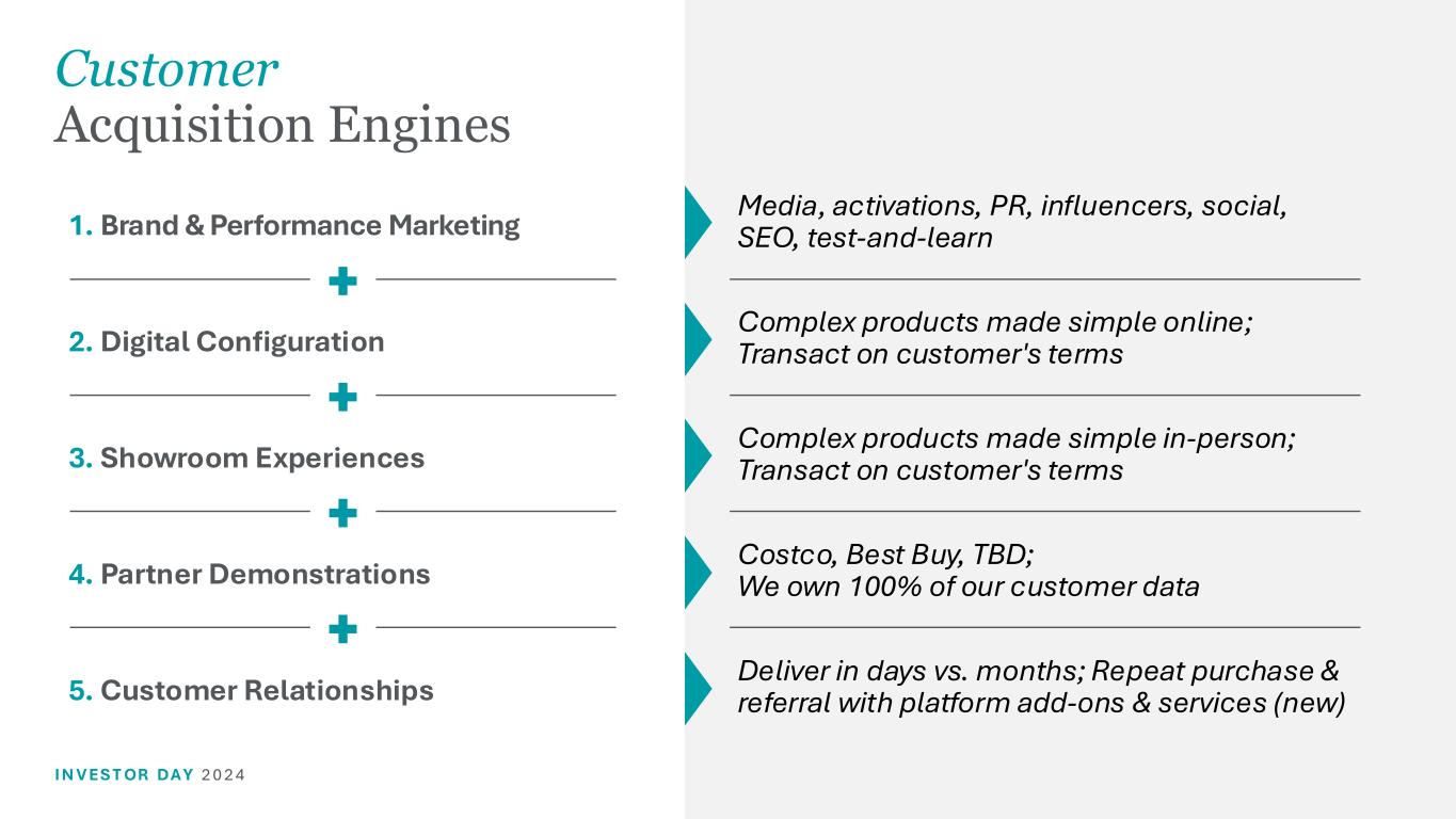 I N V ES T OR DA Y 2 0 2 4 Media, activations, PR, influencers, social, SEO, test-and-learn1. Brand & Performance Marketing Complex products made simple online; Transact on customer's terms2. Digital Configuration Complex products made simple in-person; Transact on customer's terms3. Showroom Experiences Costco, Best Buy, TBD; We own 100% of our customer data4. Partner Demonstrations Deliver in days vs. months; Repeat purchase & referral with platform add-ons & services (new)5. Customer Relationships Customer Acquisition Engines