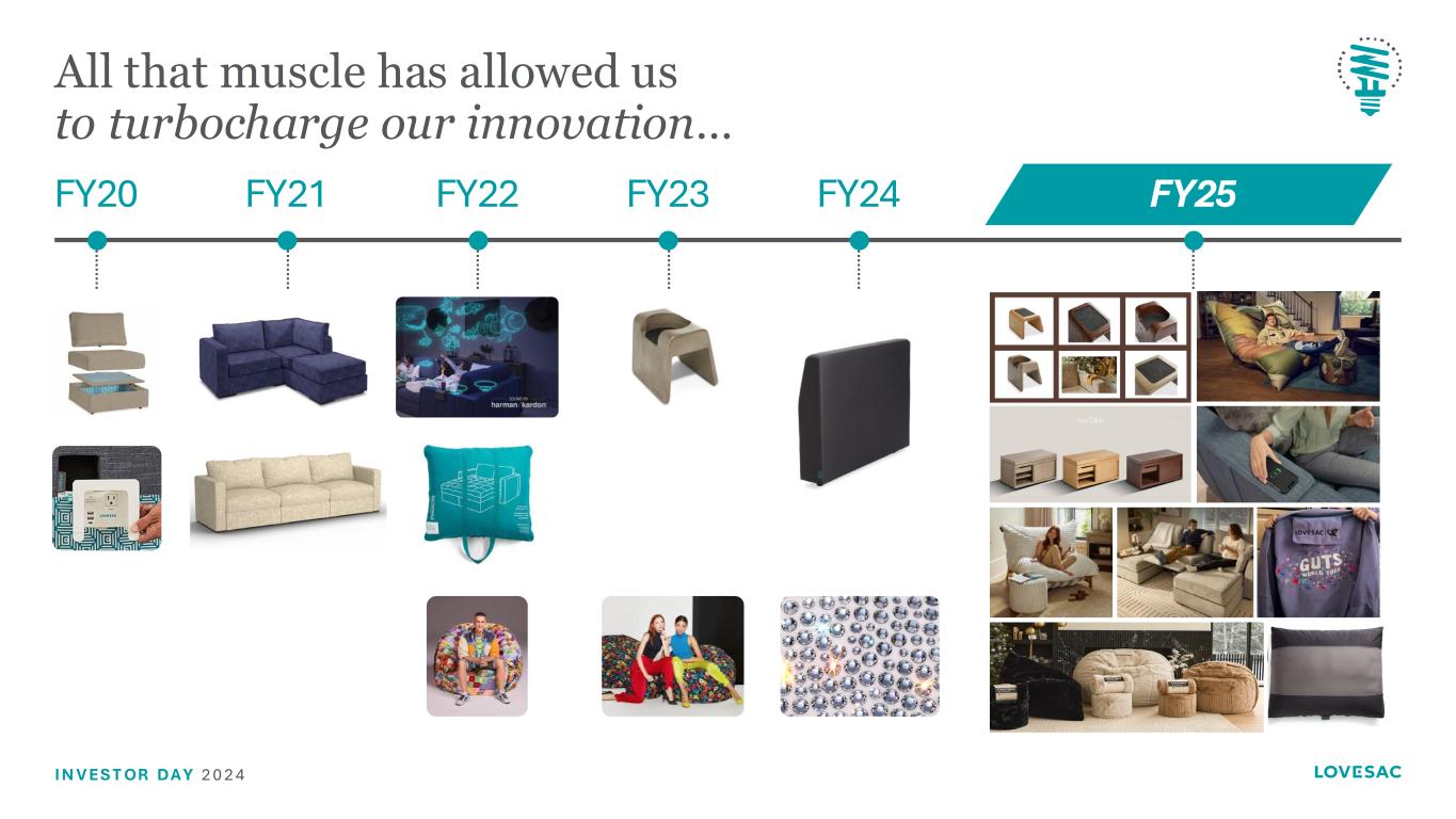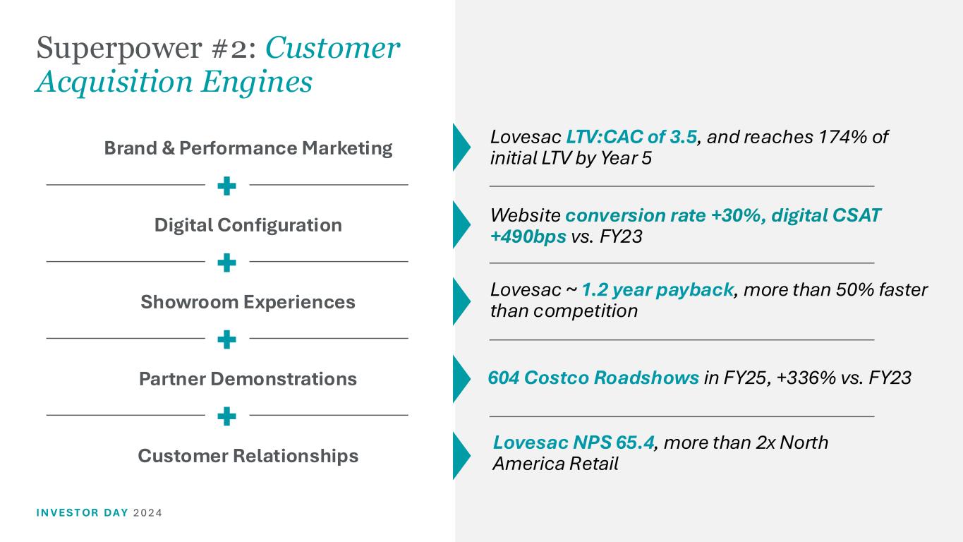 I N V ES T OR DA Y 2 0 2 4 Brand & Performance Marketing Digital Configuration Showroom Experiences Partner Demonstrations Customer Relationships Superpower #2: Customer Acquisition Engines Lovesac LTV:CAC of 3.5, and reaches 174% of initial LTV by Year 5 Website conversion rate +30%, digital CSAT +490bps vs. FY23 Lovesac ~ 1.2 year payback, more than 50% faster than competition 604 Costco Roadshows in FY25, +336% vs. FY23 Lovesac NPS 65.4, more than 2x North America Retail