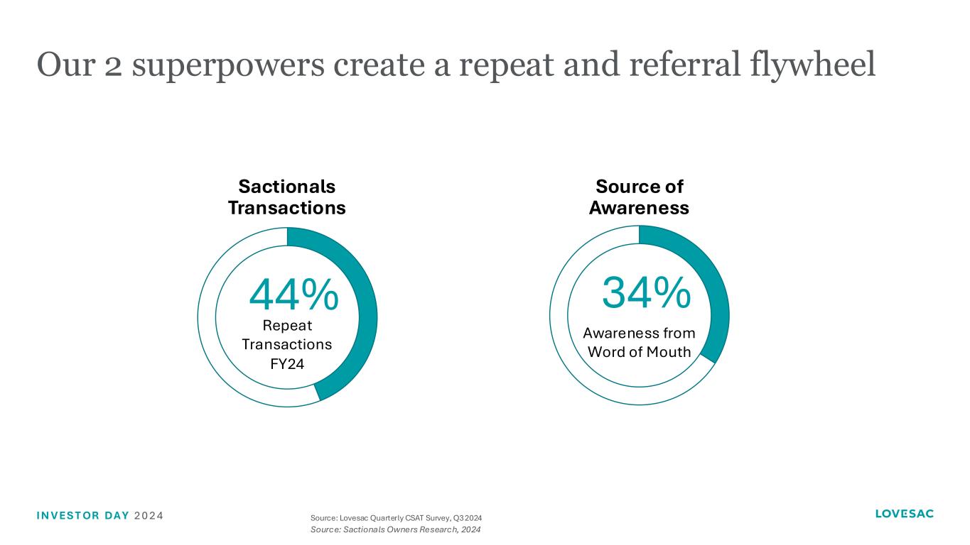 I N V ES T OR DA Y 2 0 2 4 Our 2 superpowers create a repeat and referral flywheel 44% Repeat Transactions FY24 Sactionals Transactions 34% Awareness from Word of Mouth Source of Awareness Source: Lovesac Quarterly CSAT Survey, Q3 2024 Source: Sactionals Owners Research, 2024