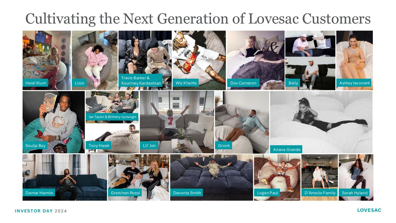 I N V ES T OR DA Y 2 0 2 4 Heidi Klum Travis Barker & Kourtney Kardashian Wiz KhalifaLizzo Belly Ashley IaconettiDov Cameron Soulja Boy Jax Taylor & Brittany Cartwright Ariana Grande Lil’ Jon GronkTony Hawk Gretchen RossiDamar Hamlin Devonta Smith D’Amelio FamilyLogan Paul Sarah Hyland Cultivating the Next Generation of Lovesac Customers