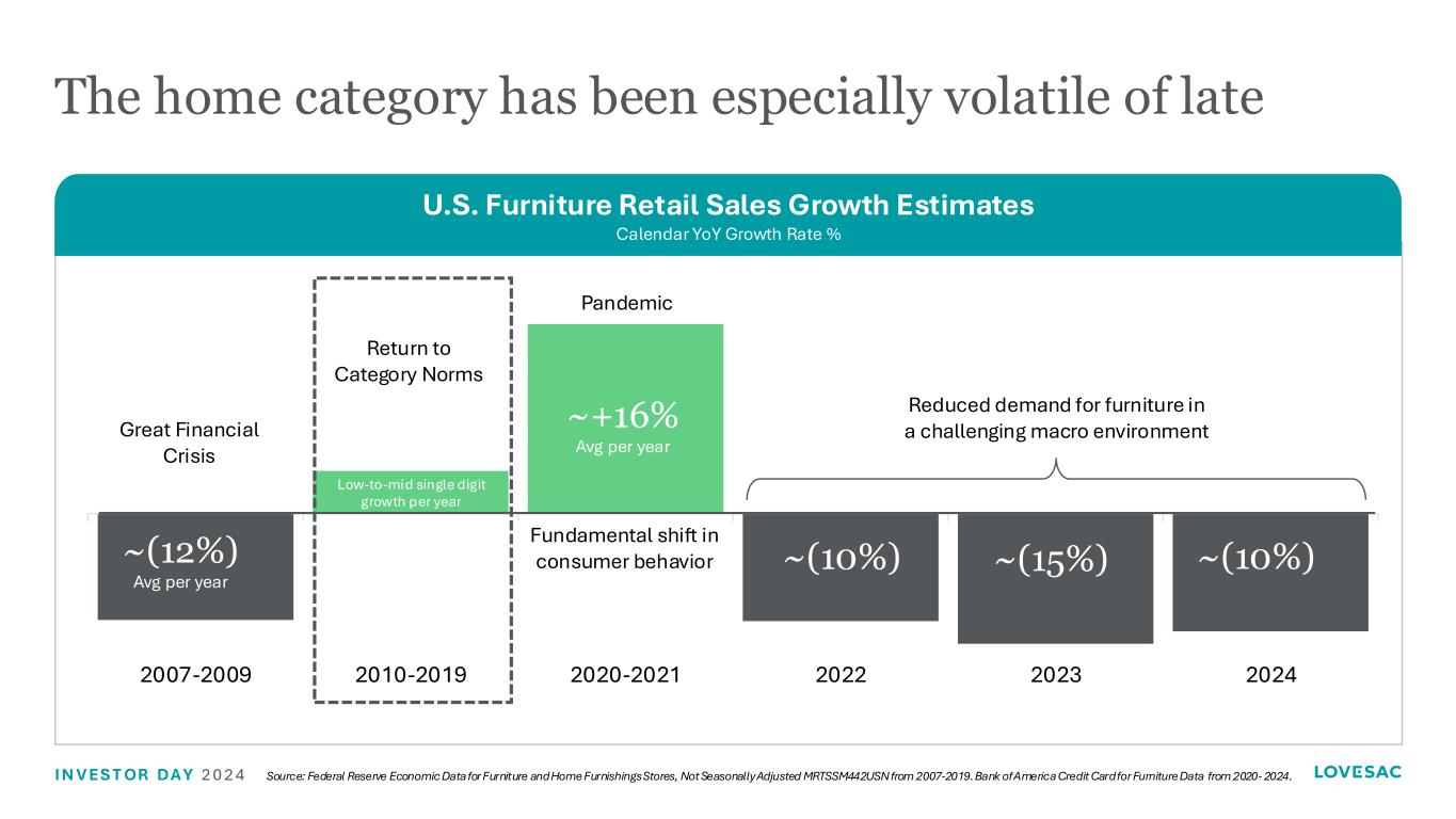 I N V ES T OR DA Y 2 0 2 4 Source: Federal Reserve Economic Data for Furniture and Home Furnishings Stores, Not Seasonally Adjusted MRTSSM442USN from 2007-2019. Bank of America Credit Card for Furniture Data from 2020- 2024. 2007-2009 2010-2019 2020-2021 2022 2023 2024 Great Financial Crisis ~(12%) Avg per year Pandemic ~+16% Avg per year Fundamental shift in consumer behavior Reduced demand for furniture in a challenging macro environment ~(10%) ~(15%) ~(10%) Low-to-mid single digit growth per year Return to Category Norms The home category has been especially volatile of late U.S. Furniture Retail Sales Growth Estimates Calendar YoY Growth Rate %