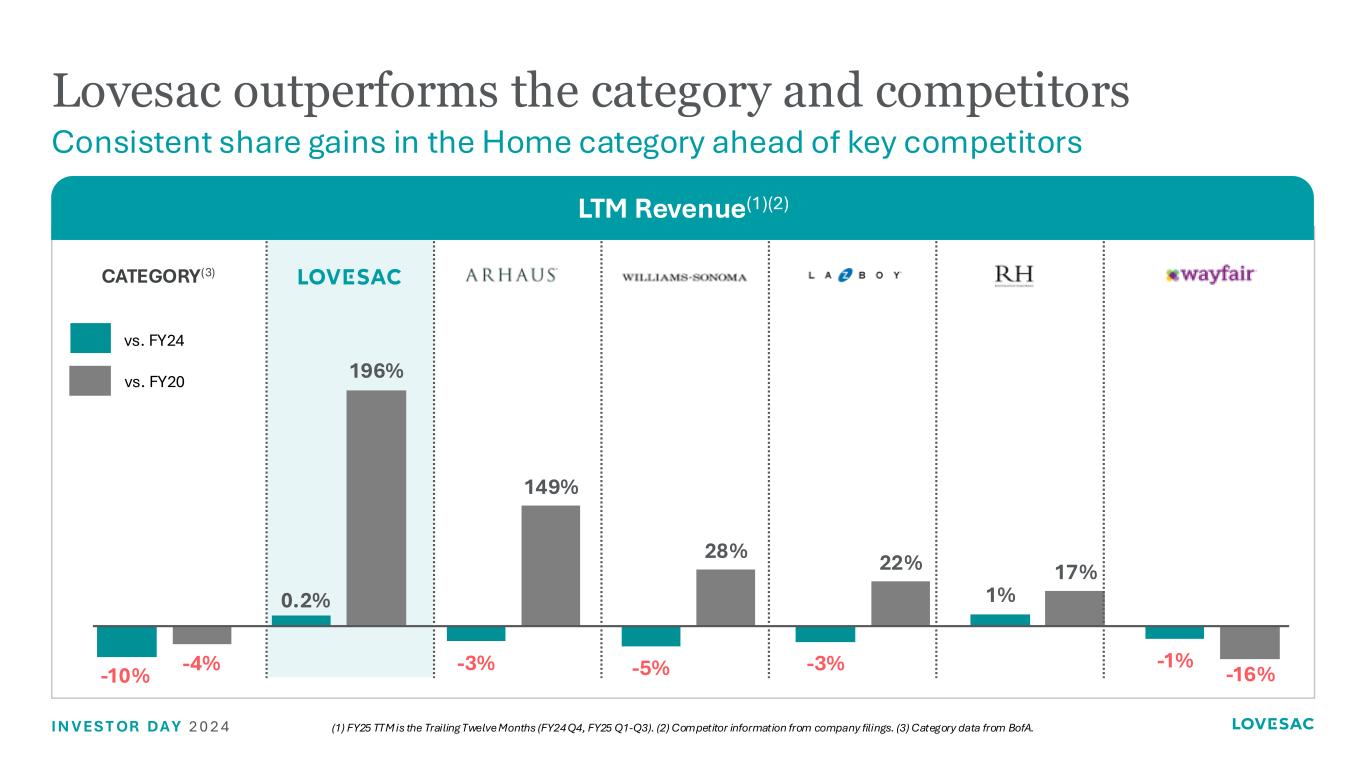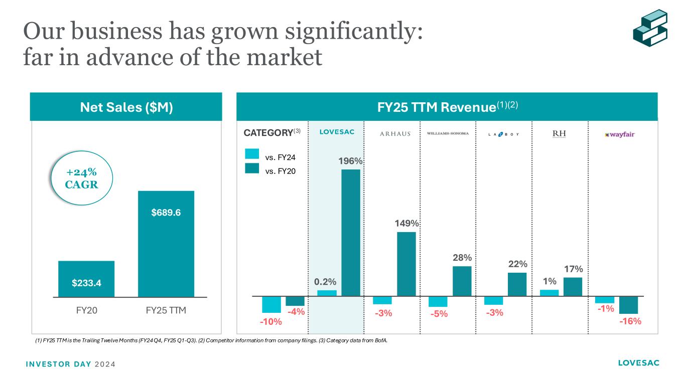 I N V ES T OR DA Y 2 0 2 4 -10% 0.2% -3% -5% -3% 1% -1%-4% 196% 149% 28% 22% 17% -16% Lovesac outperforms the category and competitors Consistent share gains in the Home category ahead of key competitors CATEGORY(3) vs. FY20 vs. FY24 (1) FY25 TTM is the Trailing Twelve Months (FY24 Q4, FY25 Q1-Q3). (2) Competitor information from company filings. (3) Category data from BofA. LTM Revenue(1)(2)