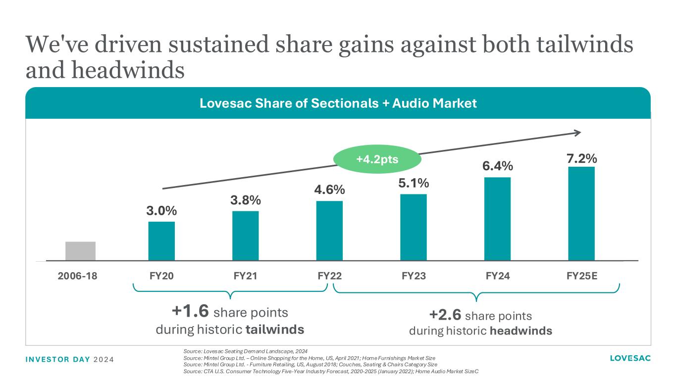 I N V ES T OR DA Y 2 0 2 4 We've driven sustained share gains against both tailwinds and headwinds 3.0% 3.8% 4.6% 5.1% 6.4% 7.2% 2006-18 FY20 FY21 FY22 FY23 FY24 FY25E +4.2pts +1.6 share points during historic tailwinds +2.6 share points during historic headwinds Lovesac Share of Sectionals + Audio Market Source: Lovesac Seating Demand Landscape, 2024 Source: Mintel Group Ltd. – Online Shopping for the Home, US, April 2021; Home Furnishings Market Size Source: Mintel Group Ltd. - Furniture Retailing, US, August 2018; Couches, Seating & Chairs Category Size Source: CTA U.S. Consumer Technology Five-Year Industry Forecast, 2020-2025 (January 2022); Home Audio Market SizeC