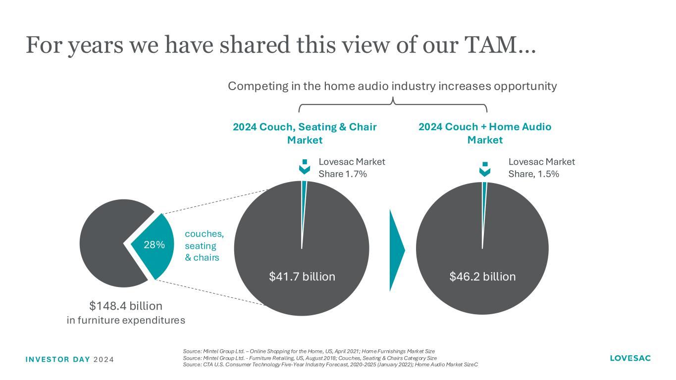 I N V ES T OR DA Y 2 0 2 4 For years we have shared this view of our TAM… $148.4 billion in furniture expenditures $38.6 billion $41.7 billion Lovesac Market Share, 1.5% Competing in the home audio industry increases opportunity $46.2 billion 2024 Couch + Home Audio Market 2024 Couch, Seating & Chair Market 28% Lovesac Market Share 1.7% couches, seating & chairs Source: Mintel Group Ltd. – Online Shopping for the Home, US, April 2021; Home Furnishings Market Size Source: Mintel Group Ltd. - Furniture Retailing, US, August 2018; Couches, Seating & Chairs Category Size Source: CTA U.S. Consumer Technology Five-Year Industry Forecast, 2020-2025 (January 2022); Home Audio Market SizeC