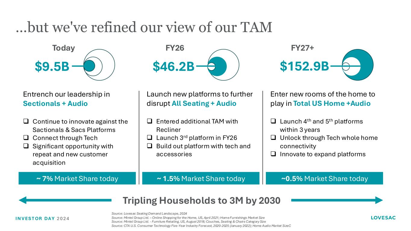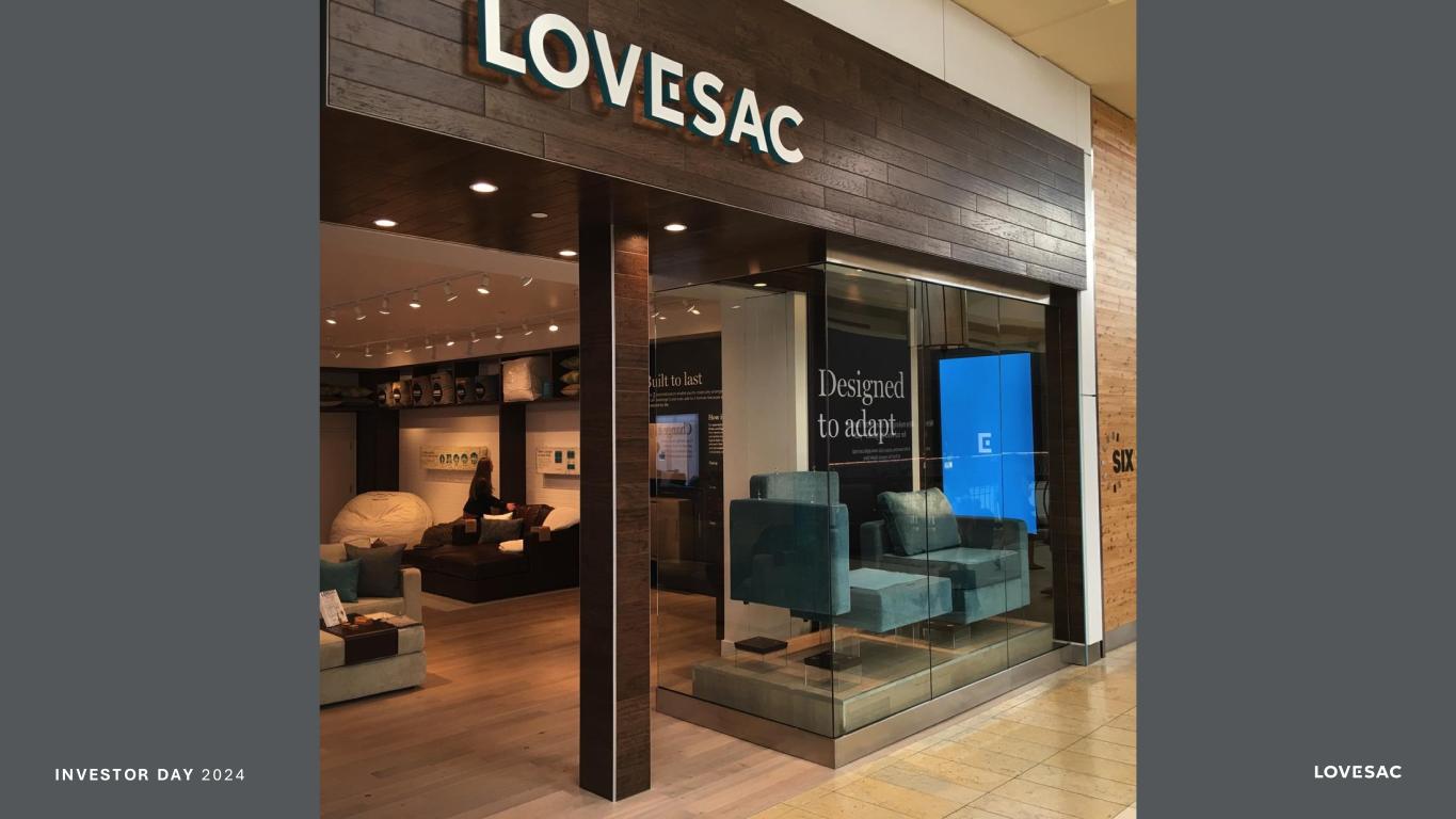 I N V ES T OR DA Y 2 0 2 4 …but we've refined our view of our TAM $9.5B $46.2B $152.9B Entrench our leadership in Sectionals + Audio ❑ Continue to innovate against the Sactionals & Sacs Platforms ❑ Connect through Tech ❑ Significant opportunity with repeat and new customer acquisition Launch new platforms to further disrupt All Seating + Audio ❑ Entered additional TAM with Recliner ❑ Launch 3rd platform in FY26 ❑ Build out platform with tech and accessories Enter new rooms of the home to play in Total US Home +Audio ❑ Launch 4th and 5th platforms within 3 years ❑ Unlock through Tech whole home connectivity ❑ Innovate to expand platforms ~ 7% Market Share today ~ 1.5% Market Share today ~0.5% Market Share today Tripling Households to 3M by 2030 Today FY26 FY27+ Source: Lovesac Seating Demand Landscape, 2024 Source: Mintel Group Ltd. – Online Shopping for the Home, US, April 2021; Home Furnishings Market Size Source: Mintel Group Ltd. - Furniture Retailing, US, August 2018; Couches, Seating & Chairs Category Size Source: CTA U.S. Consumer Technology Five-Year Industry Forecast, 2020-2025 (January 2022); Home Audio Market SizeC