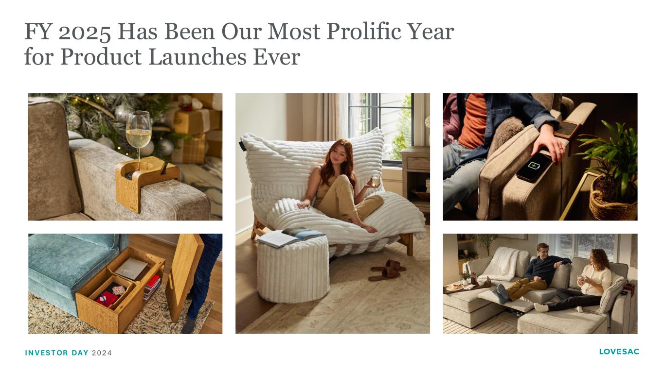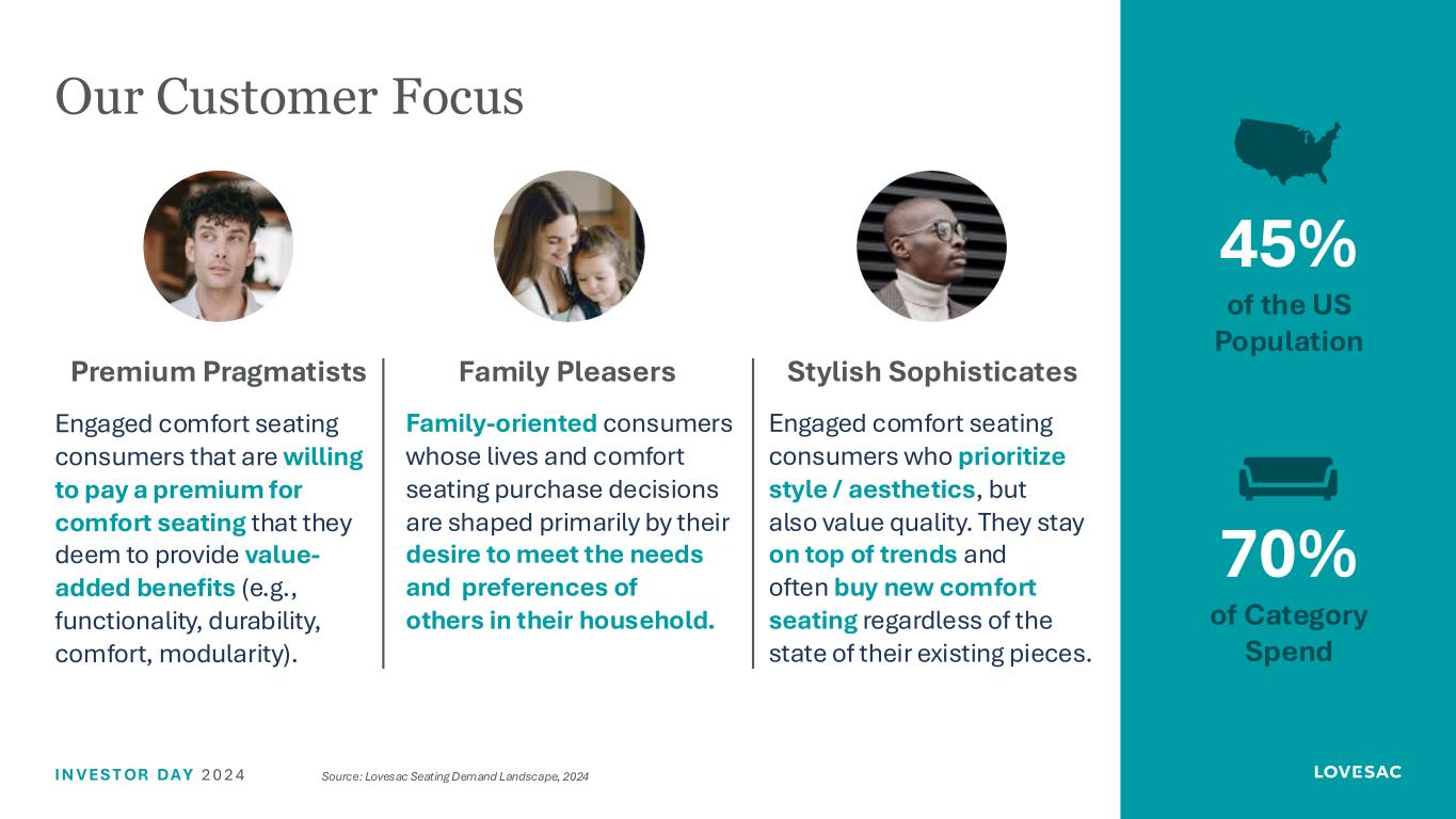 I N V ES T OR DA Y 2 0 2 4 Our Customer Focus Premium Pragmatists Stylish Sophisticates Engaged comfort seating consumers that are willing to pay a premium for comfort seating that they deem to provide value- added benefits (e.g., functionality, durability, comfort, modularity). Engaged comfort seating consumers who prioritize style / aesthetics, but also value quality. They stay on top of trends and often buy new comfort seating regardless of the state of their existing pieces. Family Pleasers Family-oriented consumers whose lives and comfort seating purchase decisions are shaped primarily by their desire to meet the needs and preferences of others in their household. 45% of the US Population 70% of Category Spend Source: Lovesac Seating Demand Landscape, 2024
