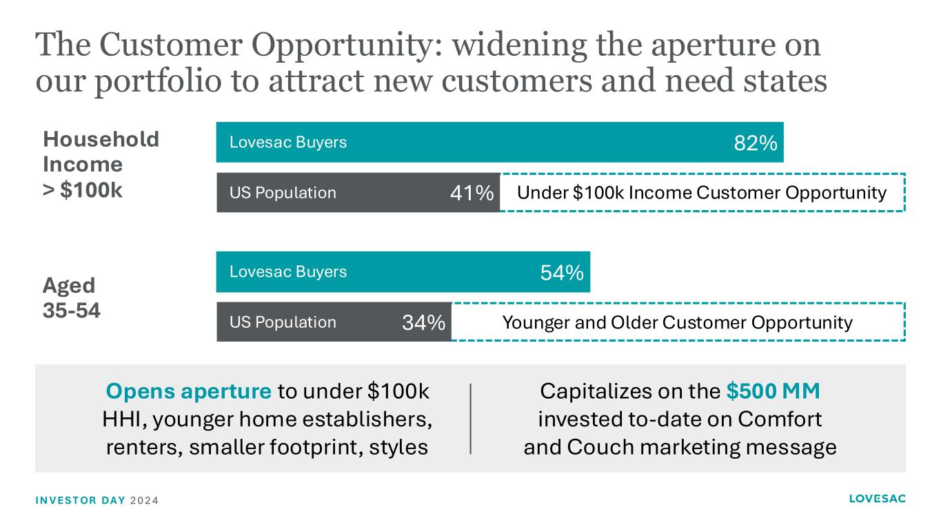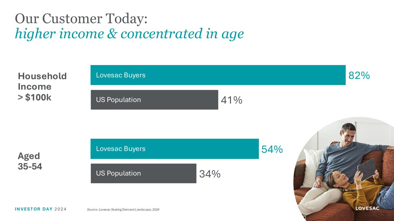 I N V ES T OR DA Y 2 0 2 4 Our Customer Today: higher income & concentrated in age 34% 41% 54% 82%Household Income > $100k US Population Lovesac Buyers Aged 35-54 US Population Lovesac Buyers Source: Lovesac Seating Demand Landscape, 2024