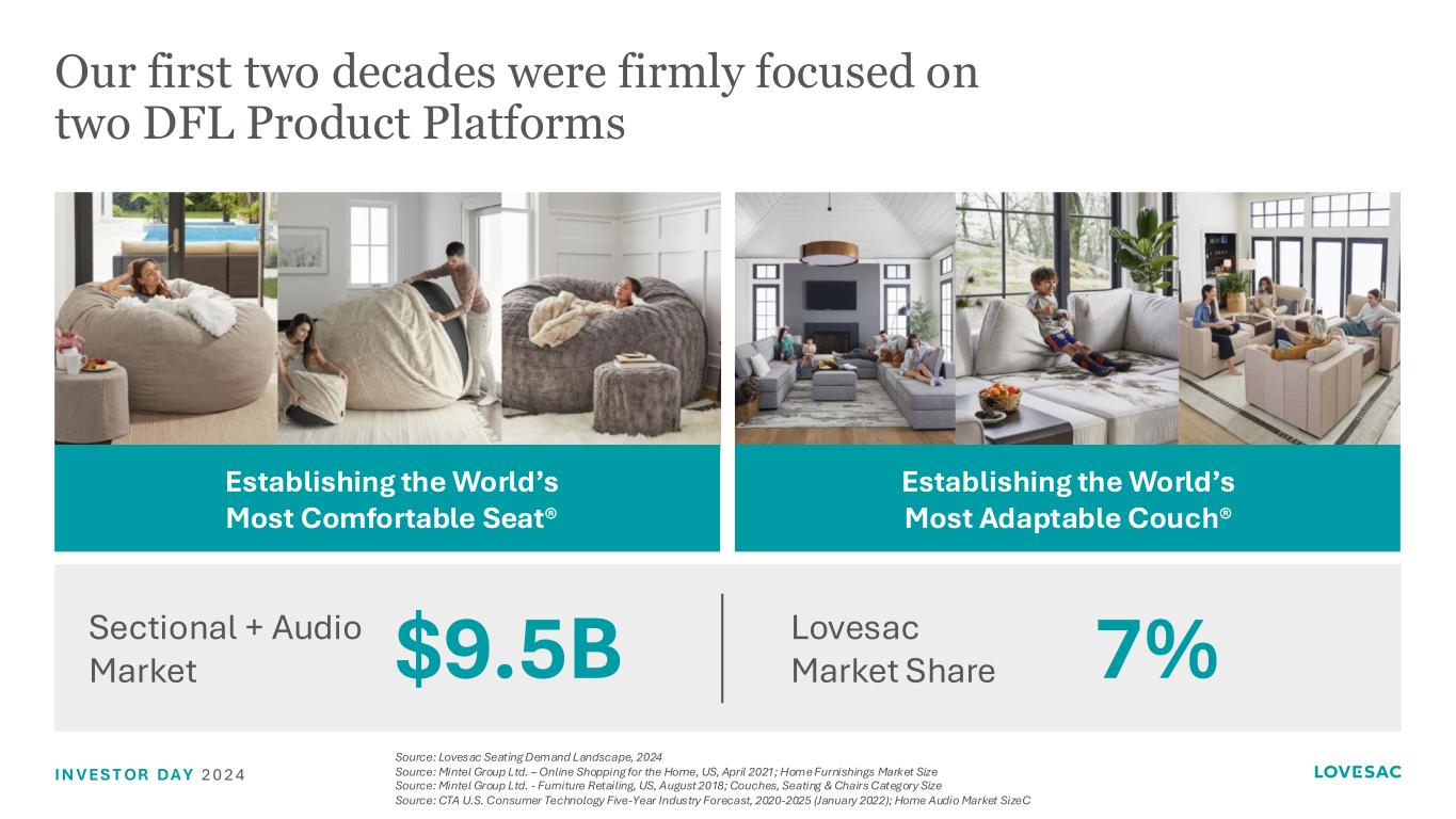 I N V ES T OR DA Y 2 0 2 4 Our first two decades were firmly focused on two DFL Product Platforms Establishing the World’s Most Comfortable Seat® Establishing the World’s Most Adaptable Couch® Sectional + Audio Market Lovesac Market Share$9.5B 7% Source: Lovesac Seating Demand Landscape, 2024 Source: Mintel Group Ltd. – Online Shopping for the Home, US, April 2021; Home Furnishings Market Size Source: Mintel Group Ltd. - Furniture Retailing, US, August 2018; Couches, Seating & Chairs Category Size Source: CTA U.S. Consumer Technology Five-Year Industry Forecast, 2020-2025 (January 2022); Home Audio Market SizeC