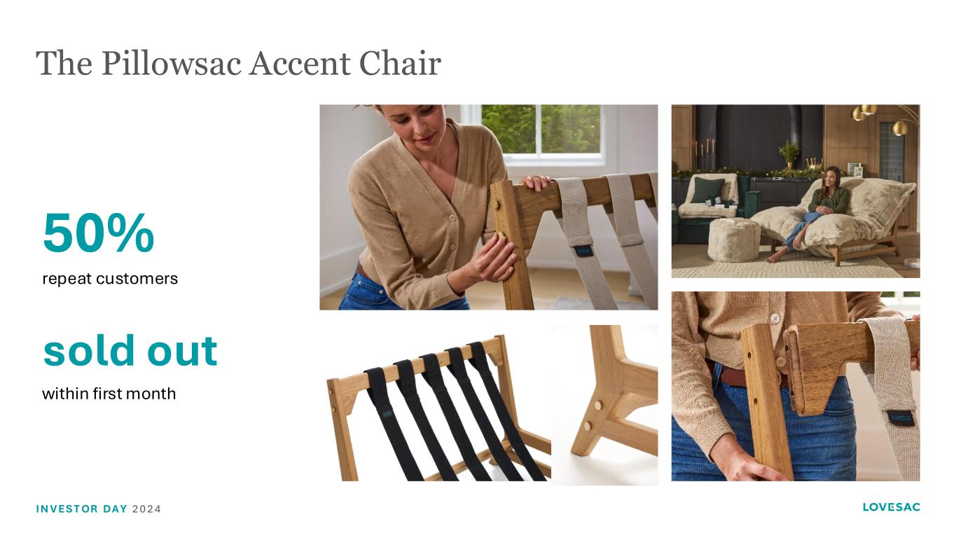 I N V ES T OR DA Y 2 0 2 4 The Pillowsac Accent Chair 50% repeat customers sold out within first month