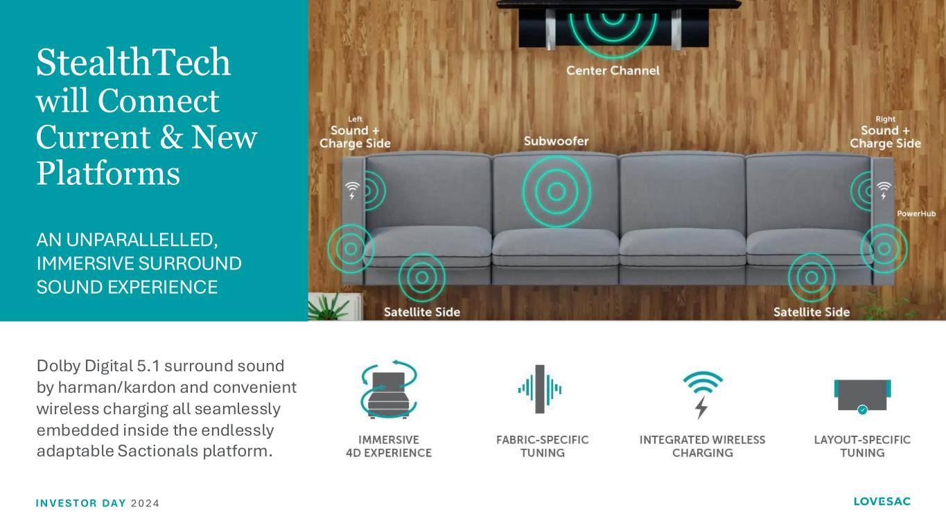 I N V ES T OR DA Y 2 0 2 4 StealthTech will Connect Current & New Platforms Dolby Digital 5.1 surround sound by harman/kardon and convenient wireless charging all seamlessly embedded inside the endlessly adaptable Sactionals platform. AN UNPARALLELLED, IMMERSIVE SURROUND SOUND EXPERIENCE