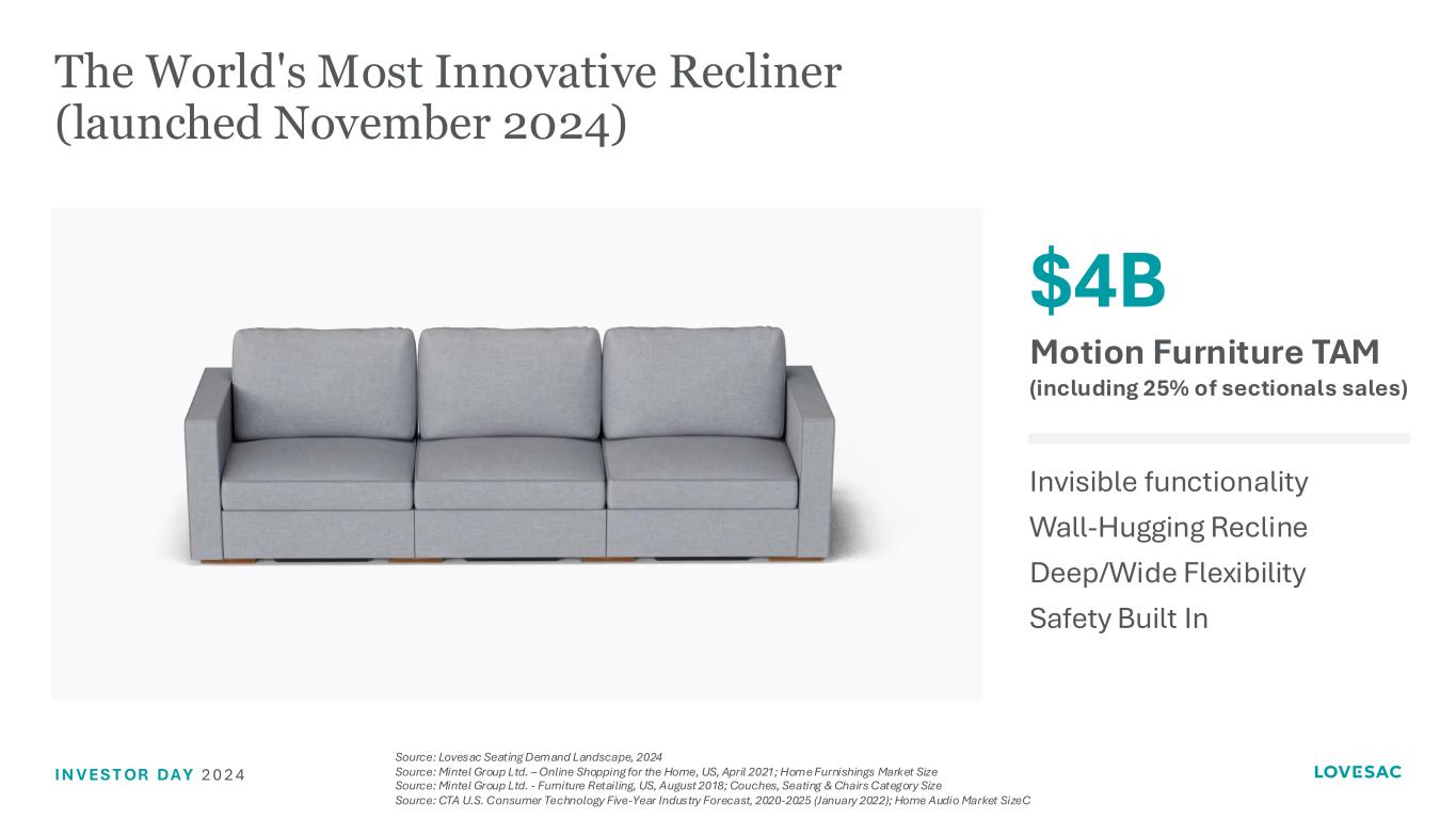I N V ES T OR DA Y 2 0 2 4 The World's Most Innovative Recliner (launched November 2024) $4B Motion Furniture TAM (including 25% of sectionals sales) Invisible functionality Wall-Hugging Recline Deep/Wide Flexibility Safety Built In Source: Lovesac Seating Demand Landscape, 2024 Source: Mintel Group Ltd. – Online Shopping for the Home, US, April 2021; Home Furnishings Market Size Source: Mintel Group Ltd. - Furniture Retailing, US, August 2018; Couches, Seating & Chairs Category Size Source: CTA U.S. Consumer Technology Five-Year Industry Forecast, 2020-2025 (January 2022); Home Audio Market SizeC